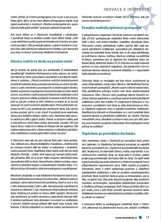 MŠ v Obrnicích v okrese Most vede Vlaďka Pechanová, která je také členkou Odborné rady Platformy pro včasnou péči. Step by Step ČR se této iniciativy účastní prostřednictvím projektu Podpora trvalé změny na Chomutovsku, kde se propojují hlavní aktéři včasné péče o děti v útlém věku ohrožené školním neúspěchem.