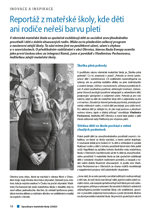 V obrnické mateřské škole se společně vzdělávají děti ze sociálně znevýhodněného prostředí i děti z dobře situovaných rodin. Může za to především celkový program a nastavení zdejší školy. Ta sází mimo jiné na prožitkové učení, učení s chybou a v souvislostech. O předškolním vzdělávání v obci Obrnice, kterou Rada Evropy ocenila jako první českou obec za integraci Romů, jsme si povídali s Vladimírou Pechanovou, ředitelkou zdejší mateřské školy.