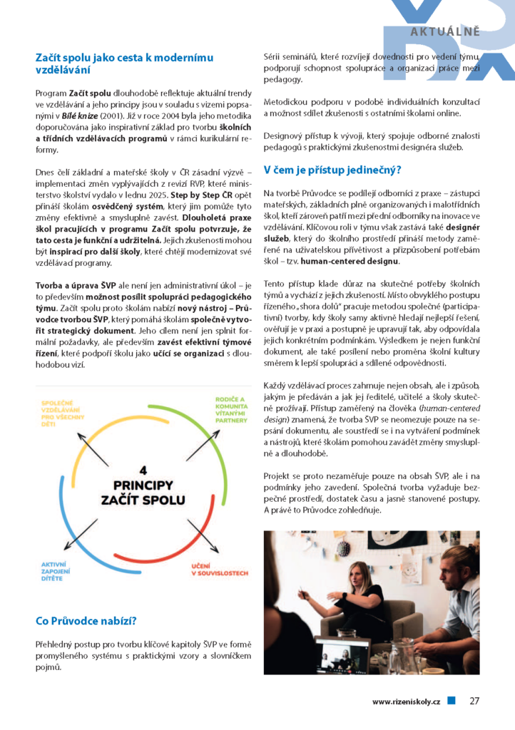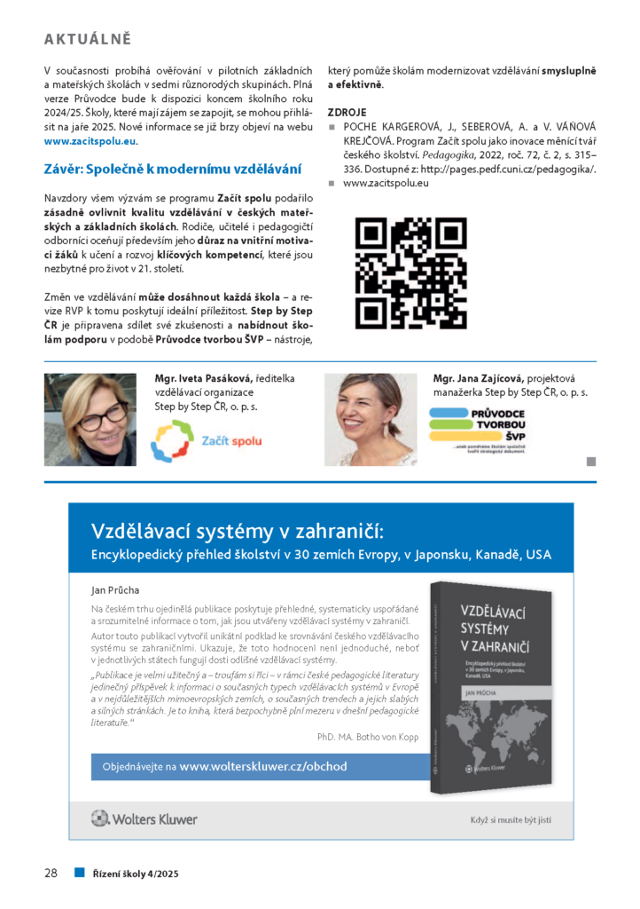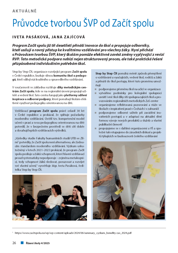 Tvorba a úprava ŠVP ale není jen administrativní úkol – je to především možnost posílit spolupráci pedagogického týmu. Začít spolu proto školám nabízí nový nástroj – Průvodce tvorbou ŠVP, který pomáhá školám společně vytvořit strategický dokument. Jeho cílem není jen splnit formální požadavky, ale především zavést efektivní týmové řízení, které podpoří školu jako učící se organizaci s dlouhodobou vizí. Ředitelka Iveta Pasáková a projektová manažerka Jana Zajícová vysvětlují, co Průvodce nabízí a v čem je přístup jedinečný.