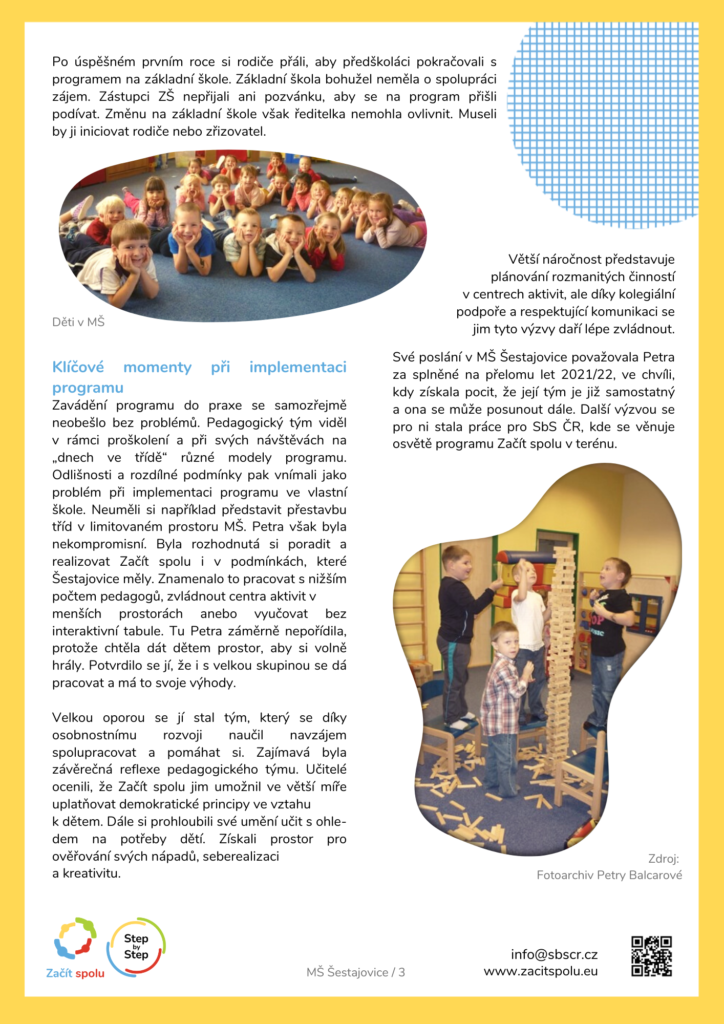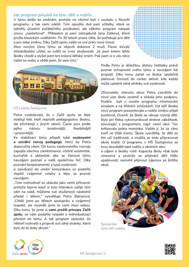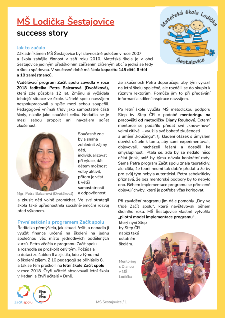 Jako první v pořadí se nabízí MŠ Lodička v Šestajovicích, mnohým z nás důvěrně známá díky své pravidelné letní škole pro MŠ a zejména díky metodičce Začít spolu Petře Balcarové (Dvořákové), která zde program zavedla do praxe.