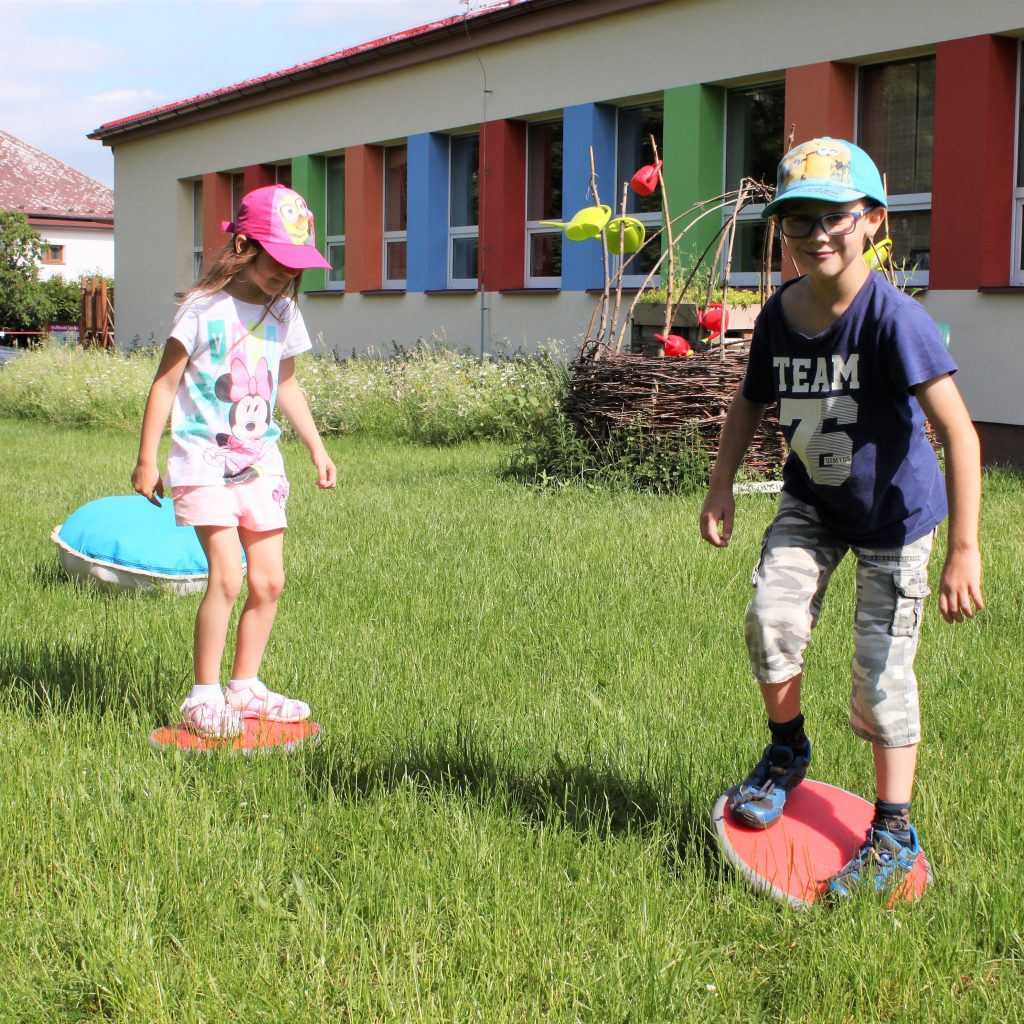 Pohybu je na školní zahradě dostatek, navíc mají děti ještě možnost probíhat labyrintem z balíků slámy ve slámovém bludišti, překonávat terénní nerovnosti při vybíhání a sbíhání ze svahu a nebo trénovat rovnováhu na balančních pomůckách.