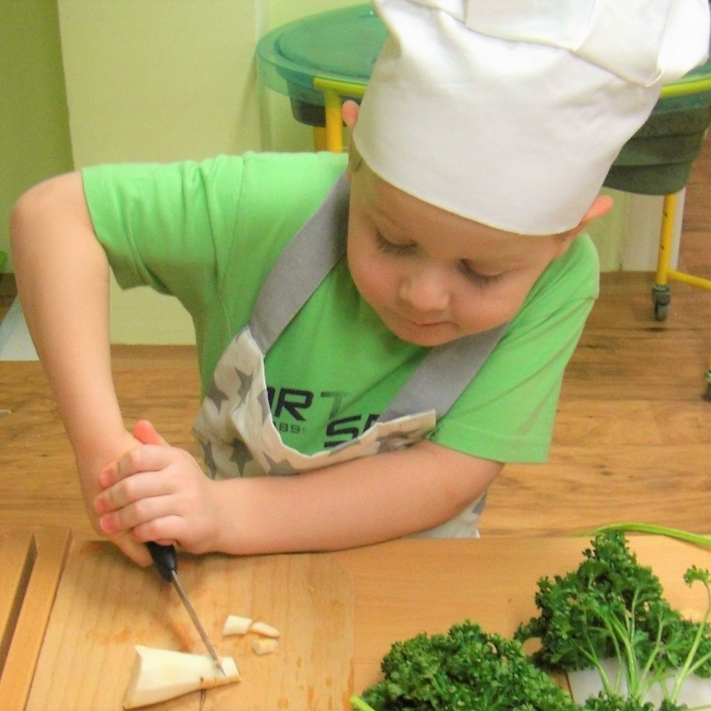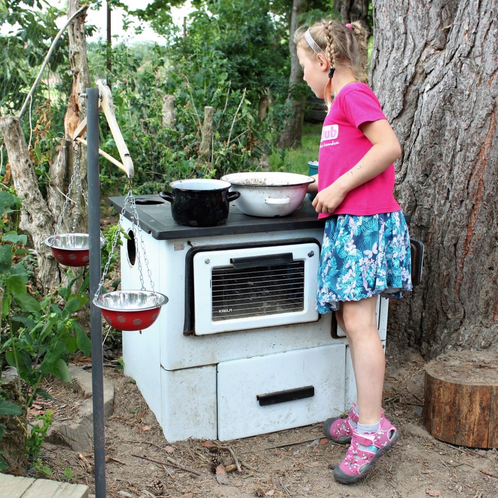Po skončení center a jejich zhodnocení se děti rozběhnou do celého prostoru zahrady, kde si mohou volně hrát v kuchyňce s nádobím, pískem, hlínou a vodou… Mají tu dvě veliké bedny s nádobím, kuchyňské váhy, sporák s troubou… a vaření v polní kuchyni může začít!