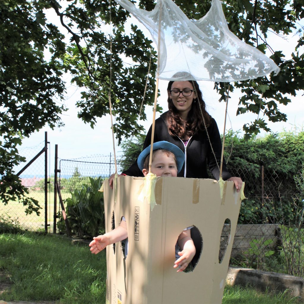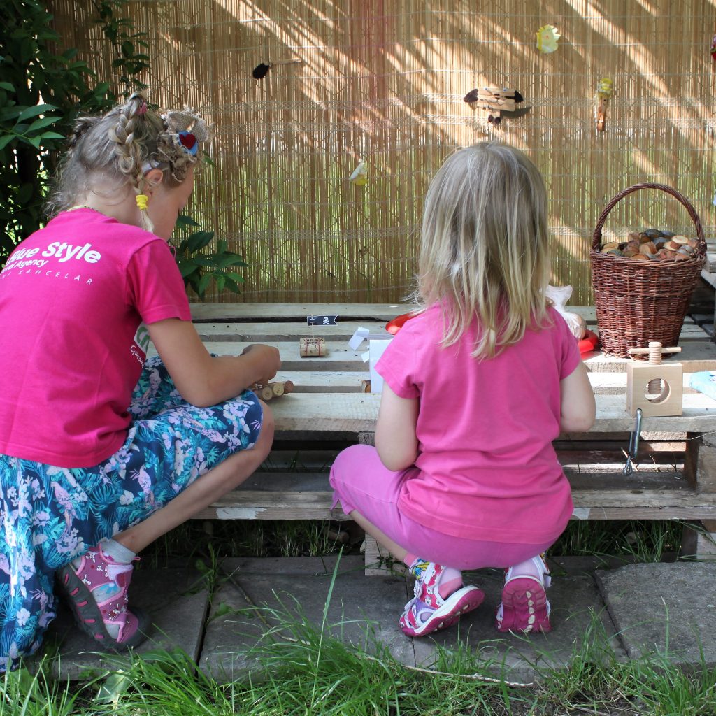 V koutku mezi keři na vyskládaných dřevních paletách se v dílně vytváří pirátská plavidla, stačí pár korkových zátek, gumičky, párátka a vystřihnout pirátskou vlajku. Která z lodiček dopluje nejdál?