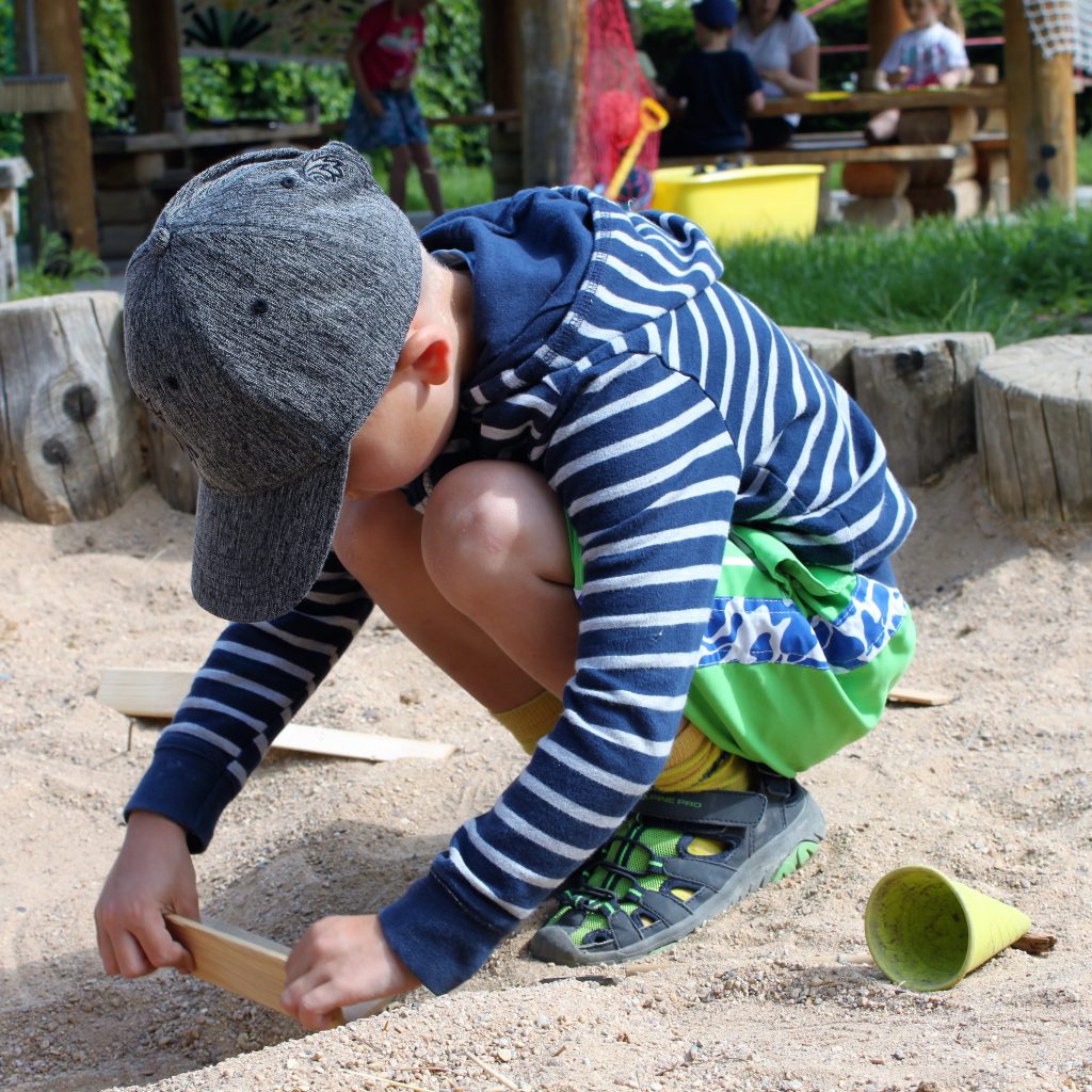 V písku piráti hledají poklad v podobě mušliček a kamínků, také tam mohou najít drobné klacíky a ze všech nálezů postavit stavbu, postavu, mandalu, podle vzoru i fantazie.