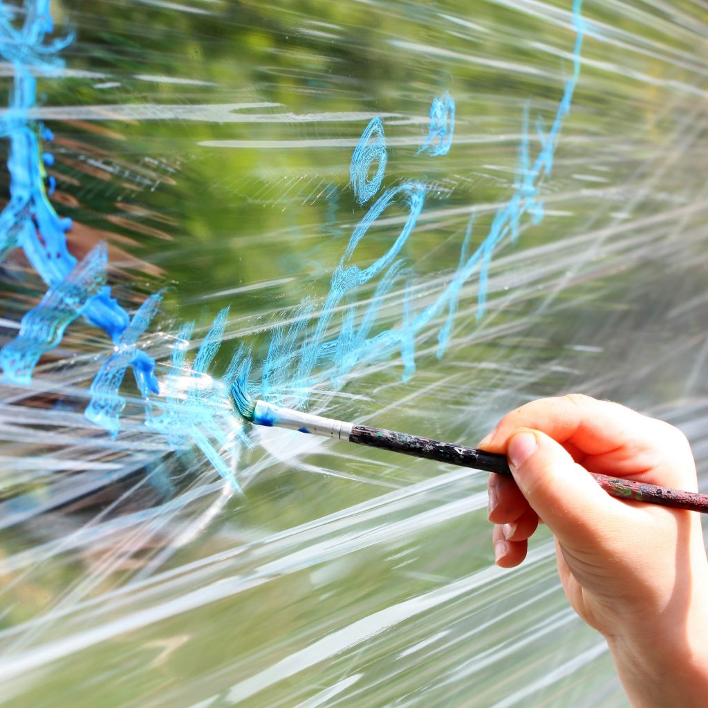 Na fólii nataženou mezi stromy mohou děti malovat jako na plátno a motivem je: Jaké počasí měli piráti při pobytu na ostrově – samá sluníčka ☺