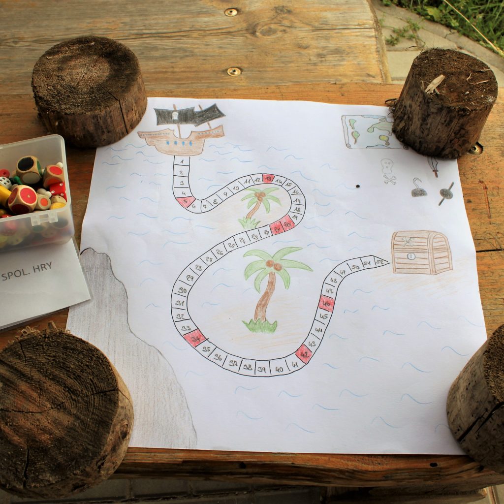 Pirátská stezka za pokladem v altánu, děti zde mohou s pomocí figurek a kostky přejít nebezpečnou soutěskou přímo za pokladem.