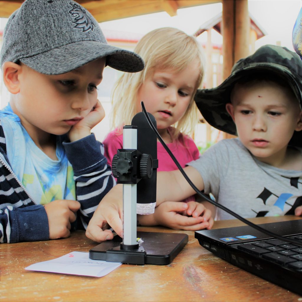 Jednoduchým mikroskopem připojeným na počítač si děti mohou prohlížet nalezené přírodniny, listy, květy a to přímo na zahradě v zahradním altánu a to ihned, jak je na zahradě objeví…