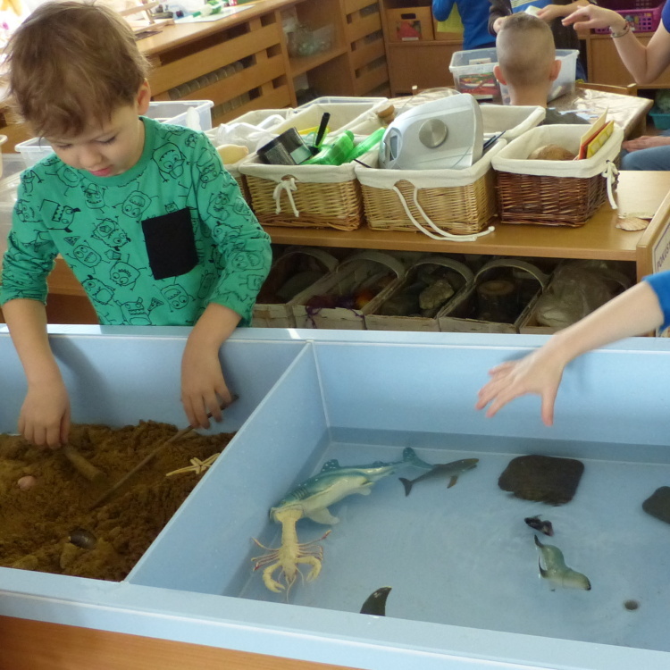 Jedná se o velký speciální box, ve kterém je umístěna vana rozdělená na 2 části – vodu a písek. Ve spodní části si děti odkládají nejrůznější pomůcky do hry/tvorby – bábovičky, lopatky, odměrky, stříkačky, nejrůznější přírodniny, aj.