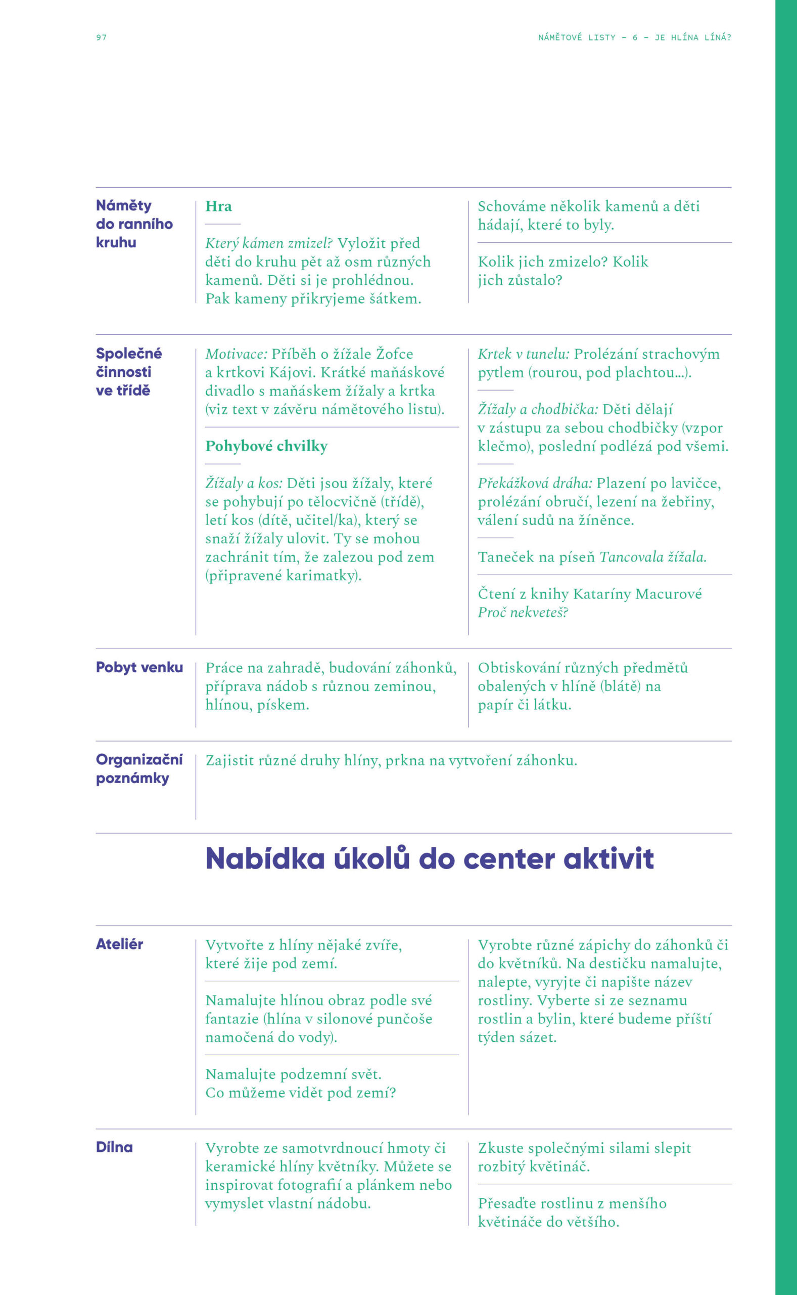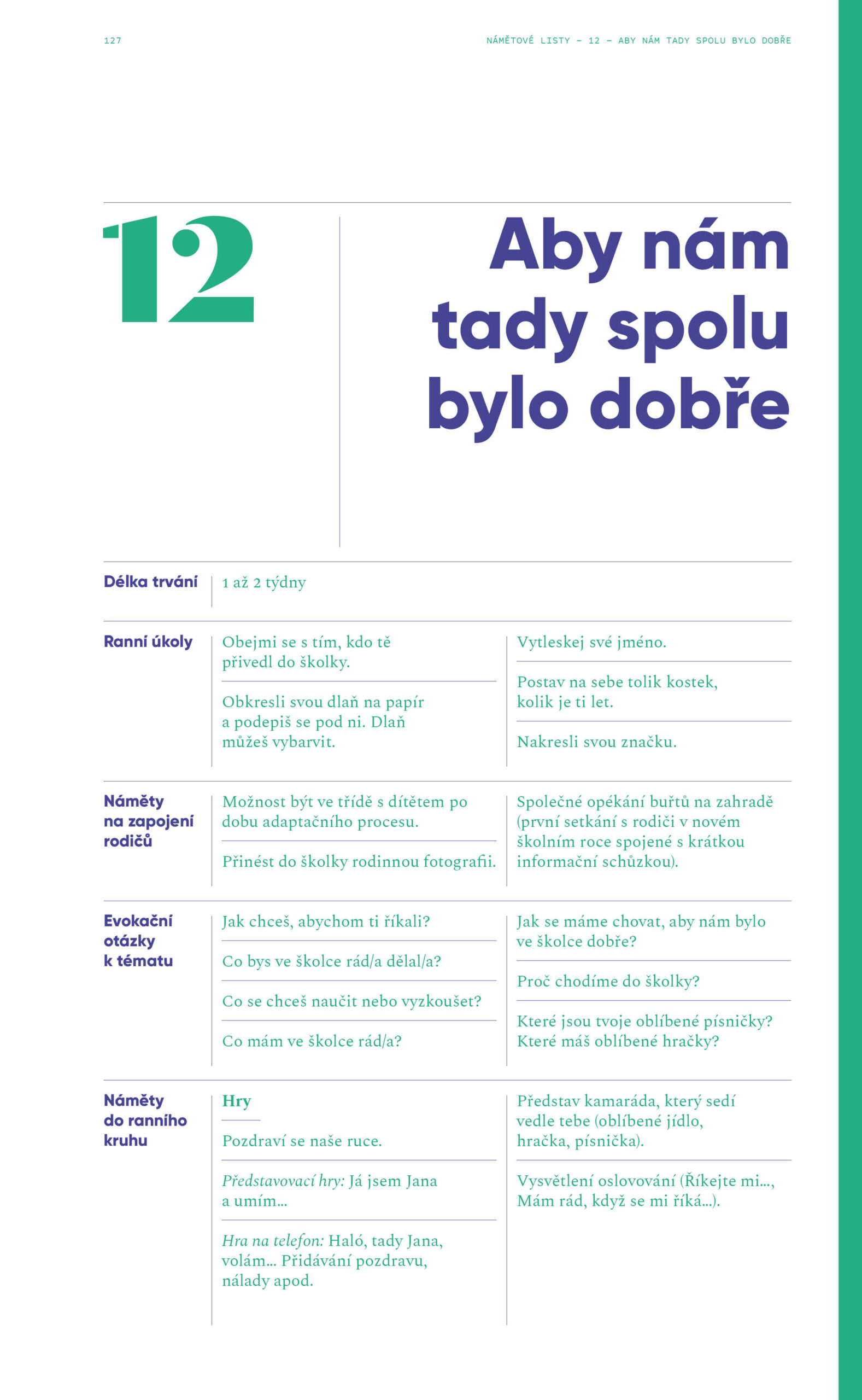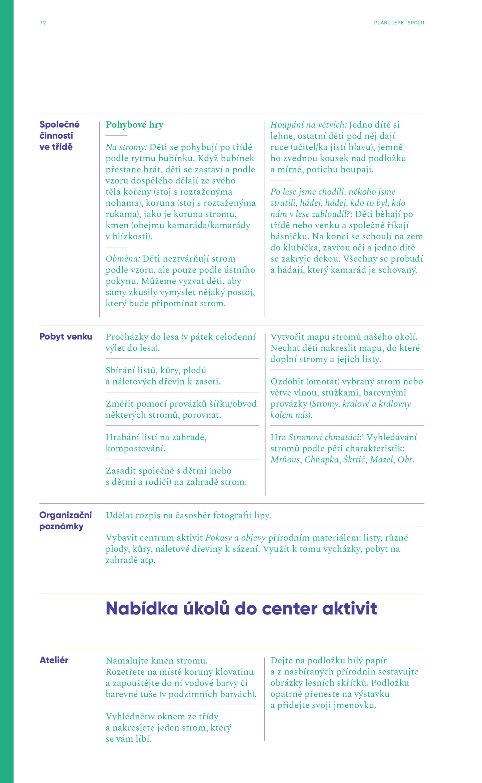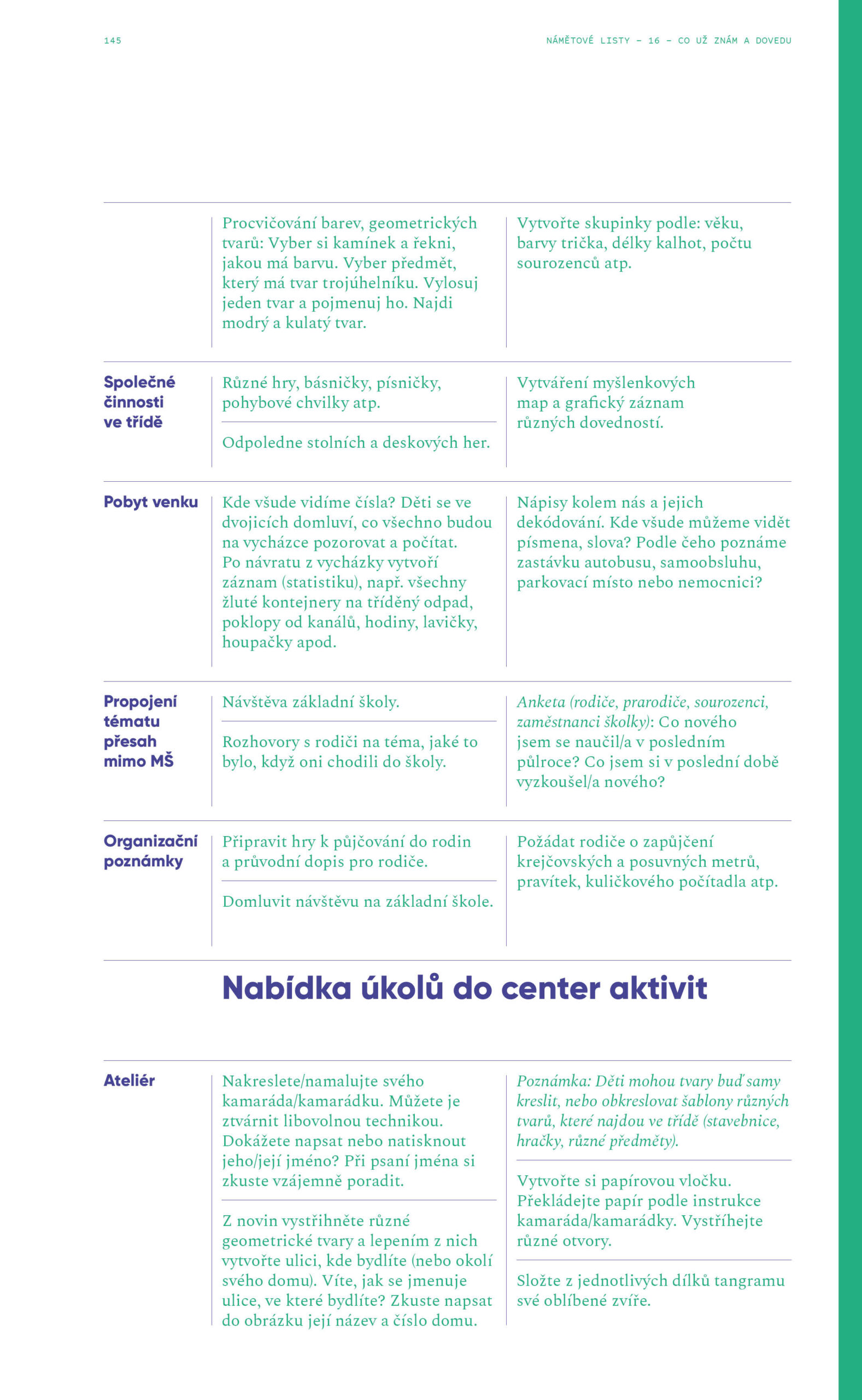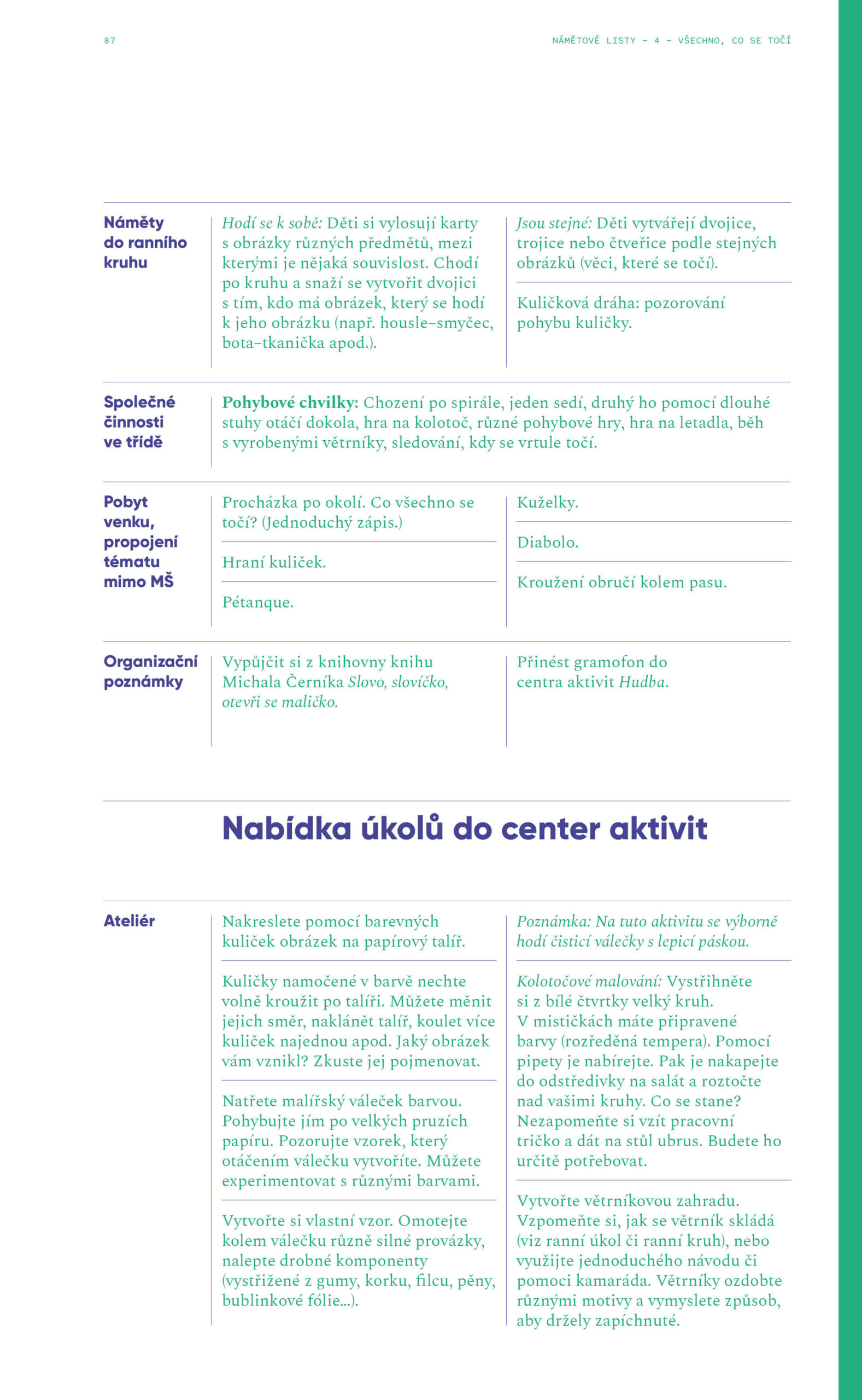 Druhá část obsahuje 20 praktických příkladů zpracovaných do podoby námětových listů (NL). Ty vychází z různých integrovaných tematických bloků, které byly realizované v mateřských školách Začít spolu. Každý NL obsahuje konkrétní příklady, jak rozpracovat jedno téma do všech center aktivit, jak jej propojit s ranními úkoly, činnostmi v ranním kruhu, jak téma přiblížit dětem i mimo MŠ, nabízí možnosti, jak zapojit rodiče atp.