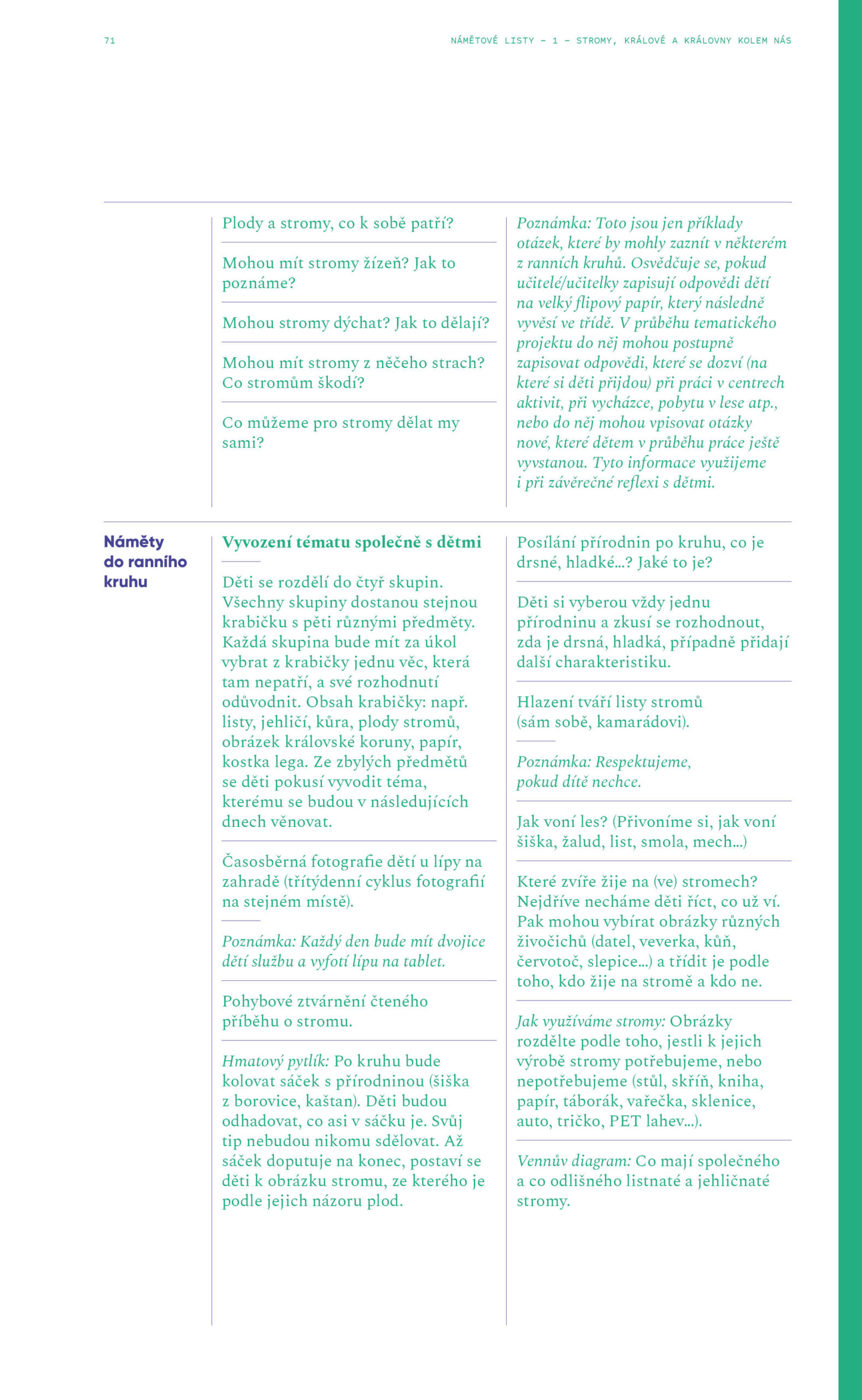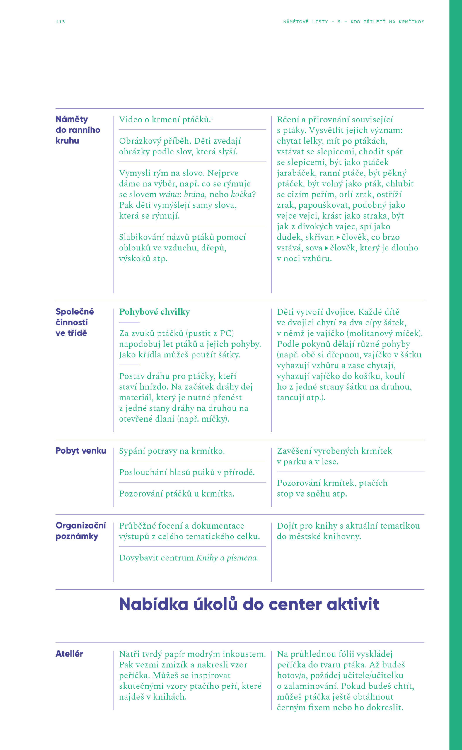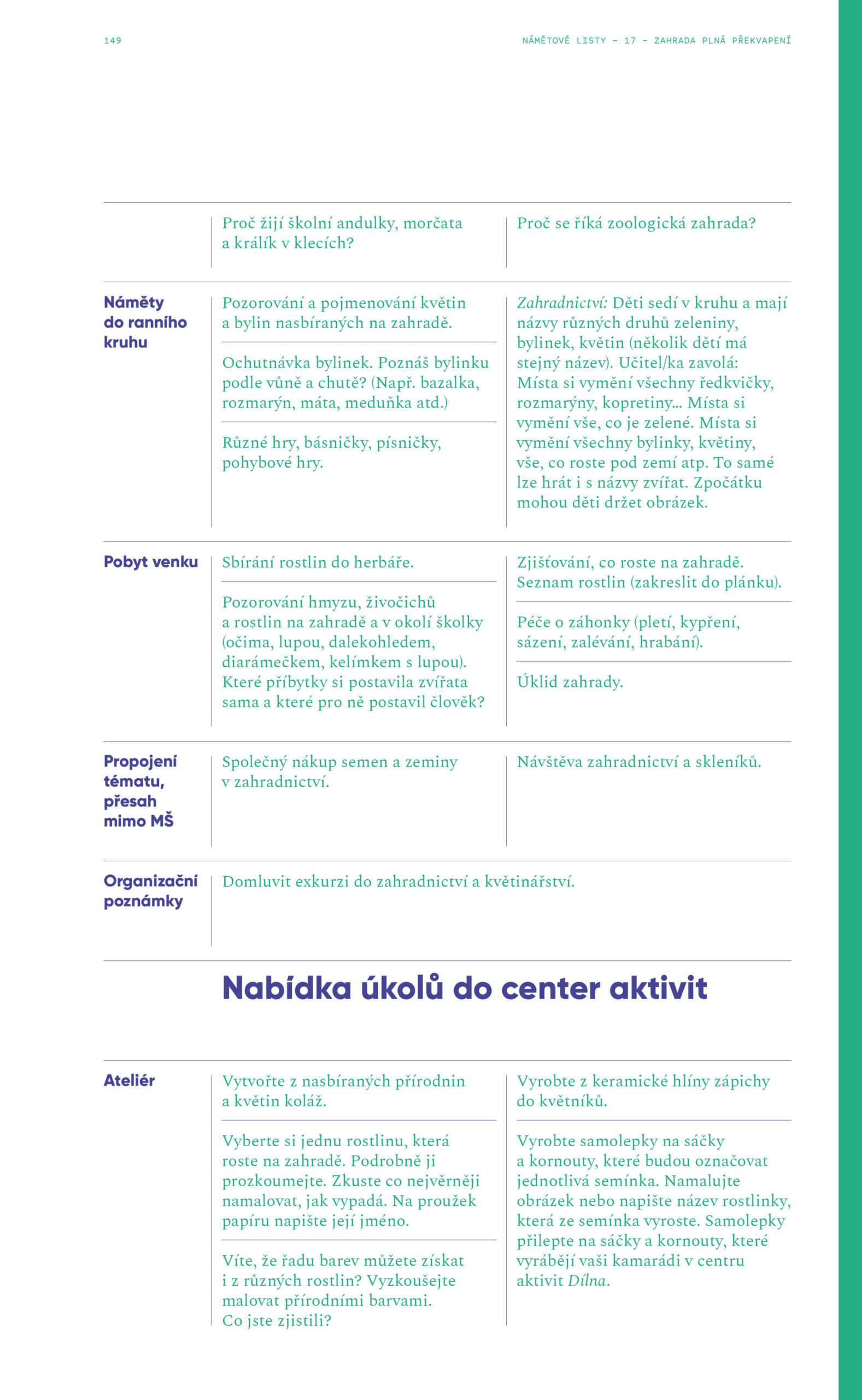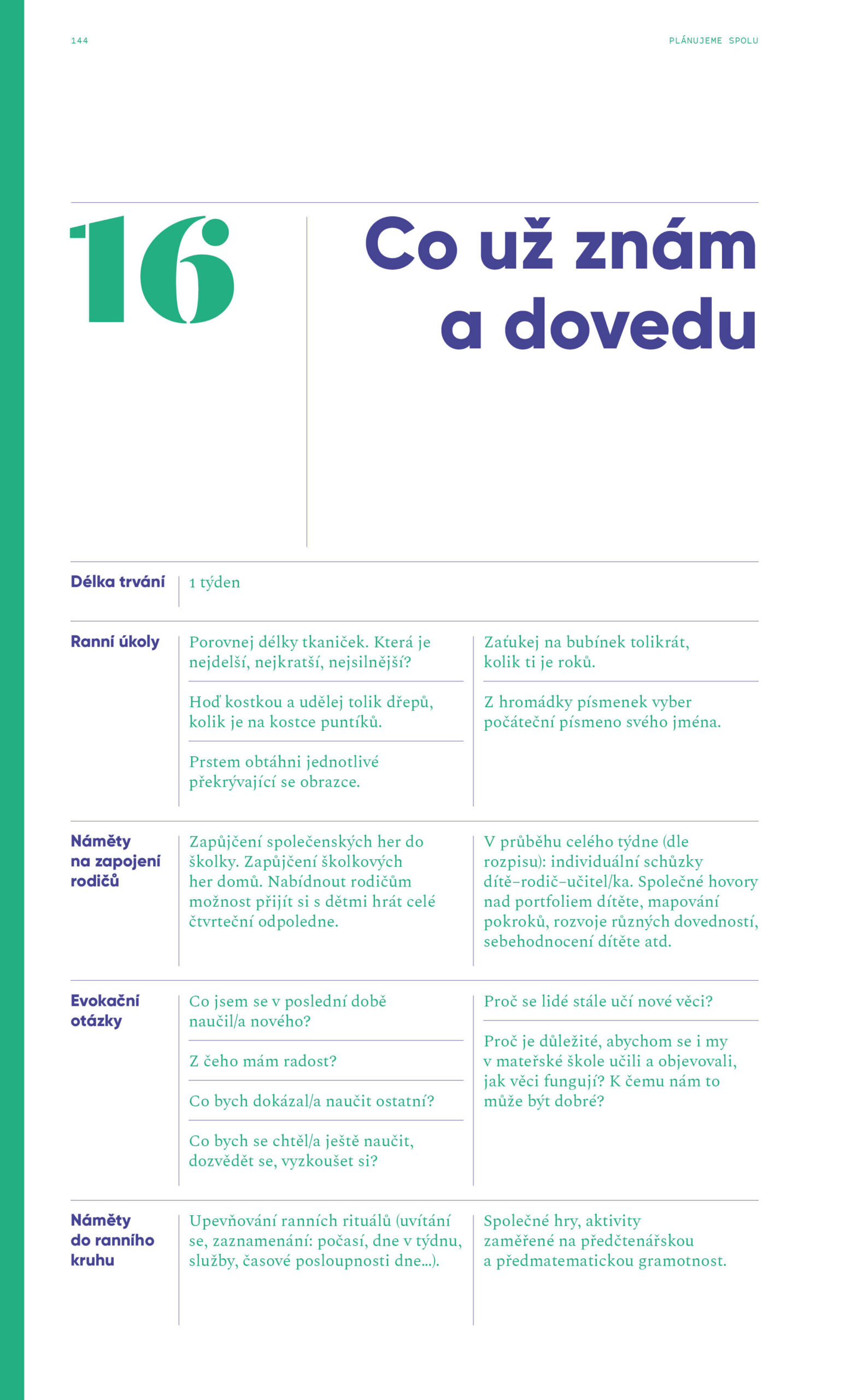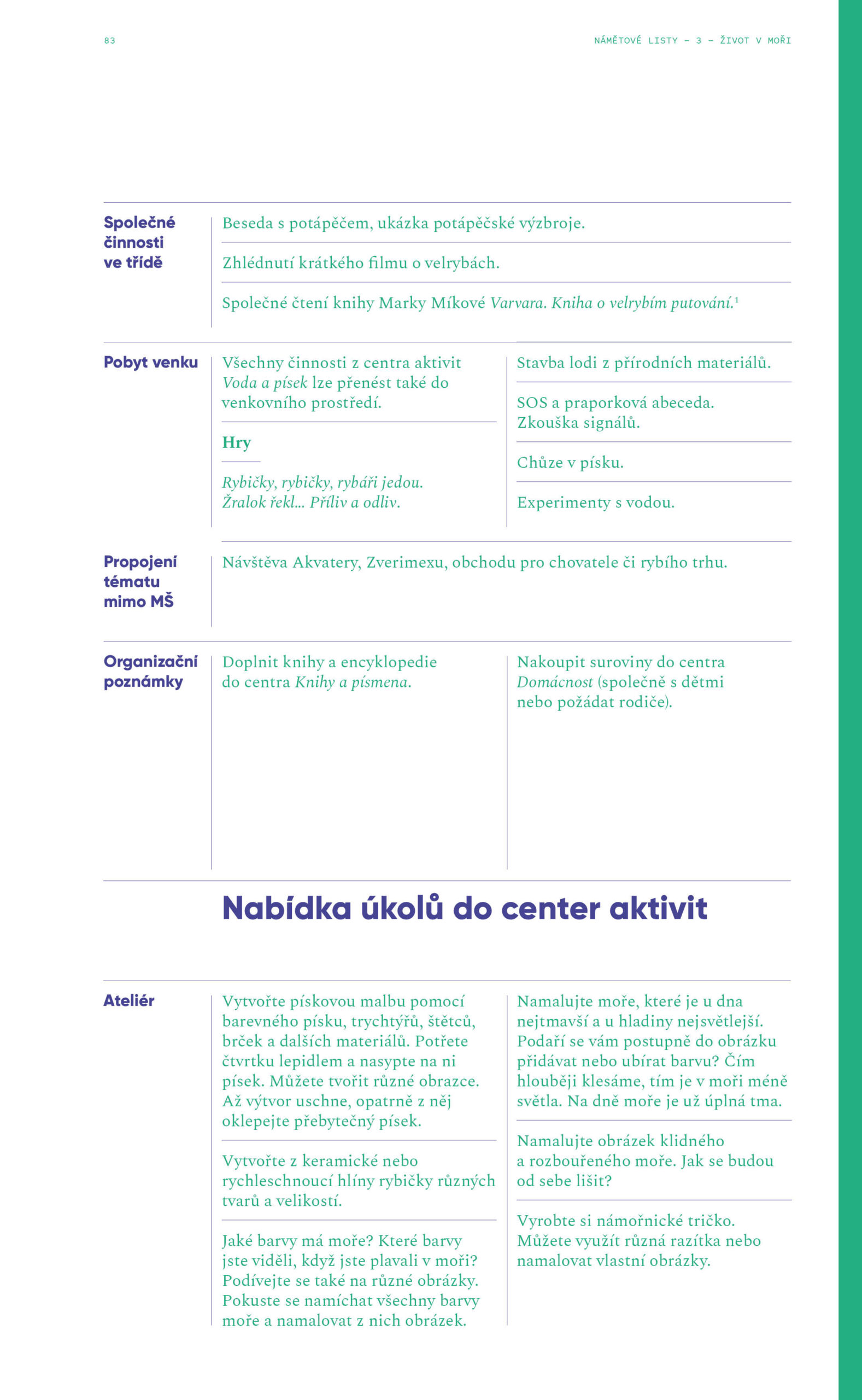 Druhá část obsahuje 20 praktických příkladů zpracovaných do podoby námětových listů (NL). Ty vychází z různých integrovaných tematických bloků, které byly realizované v mateřských školách Začít spolu. Každý NL obsahuje konkrétní příklady, jak rozpracovat jedno téma do všech center aktivit, jak jej propojit s ranními úkoly, činnostmi v ranním kruhu, jak téma přiblížit dětem i mimo MŠ, nabízí možnosti, jak zapojit rodiče atp.