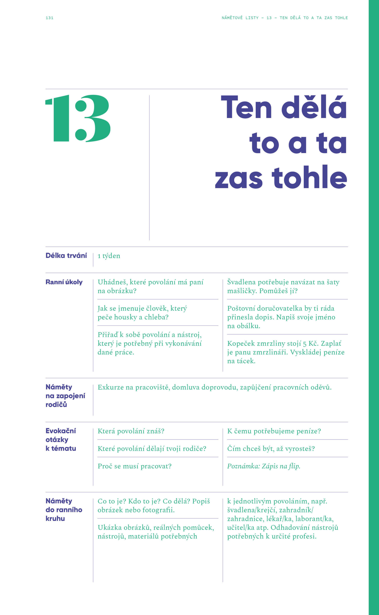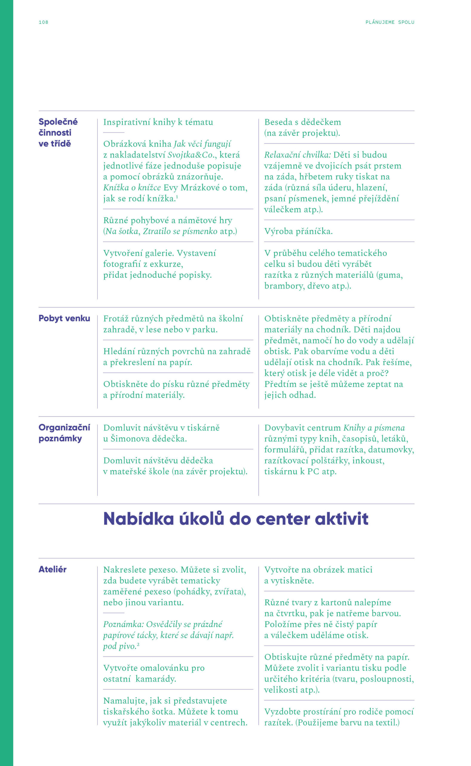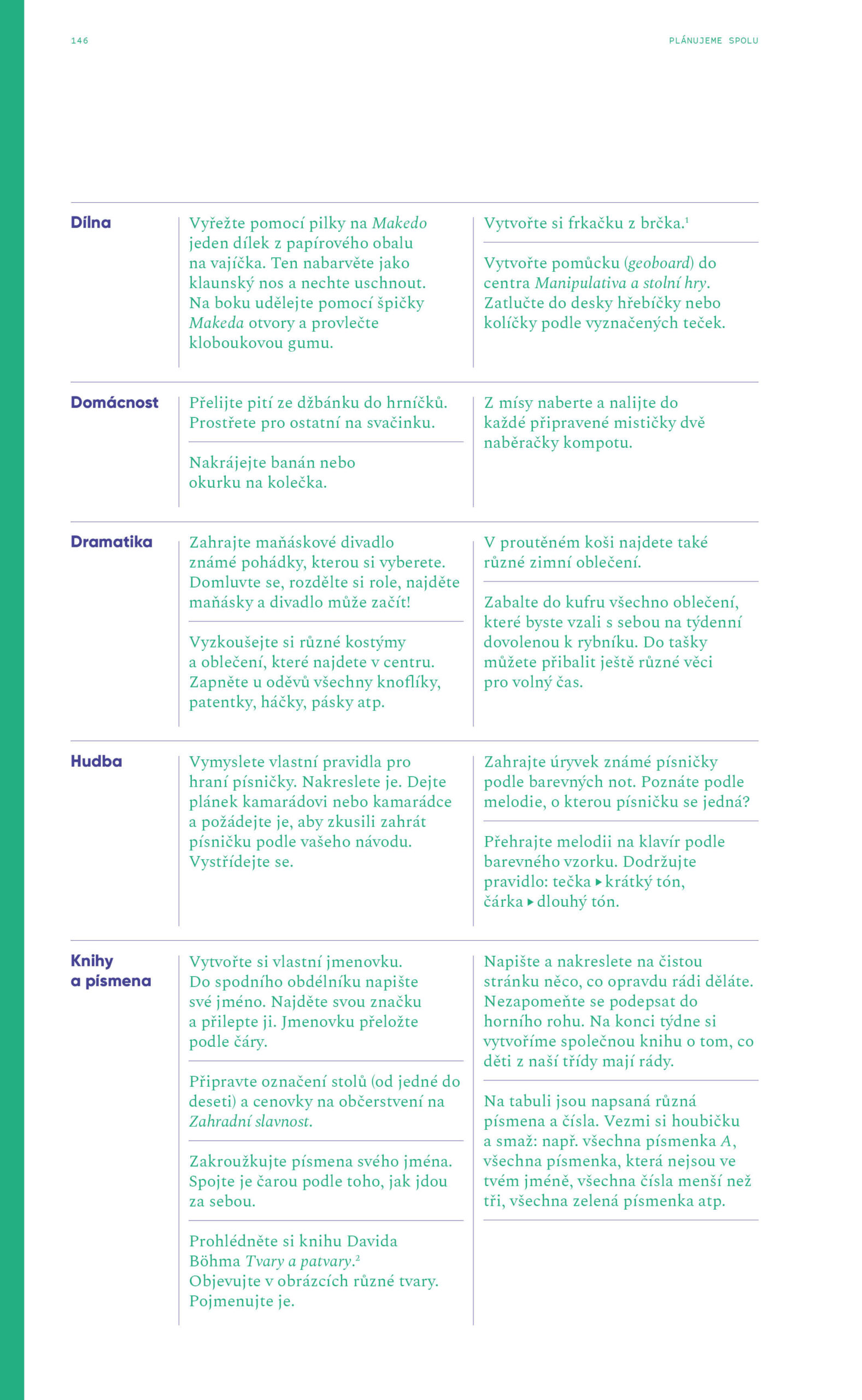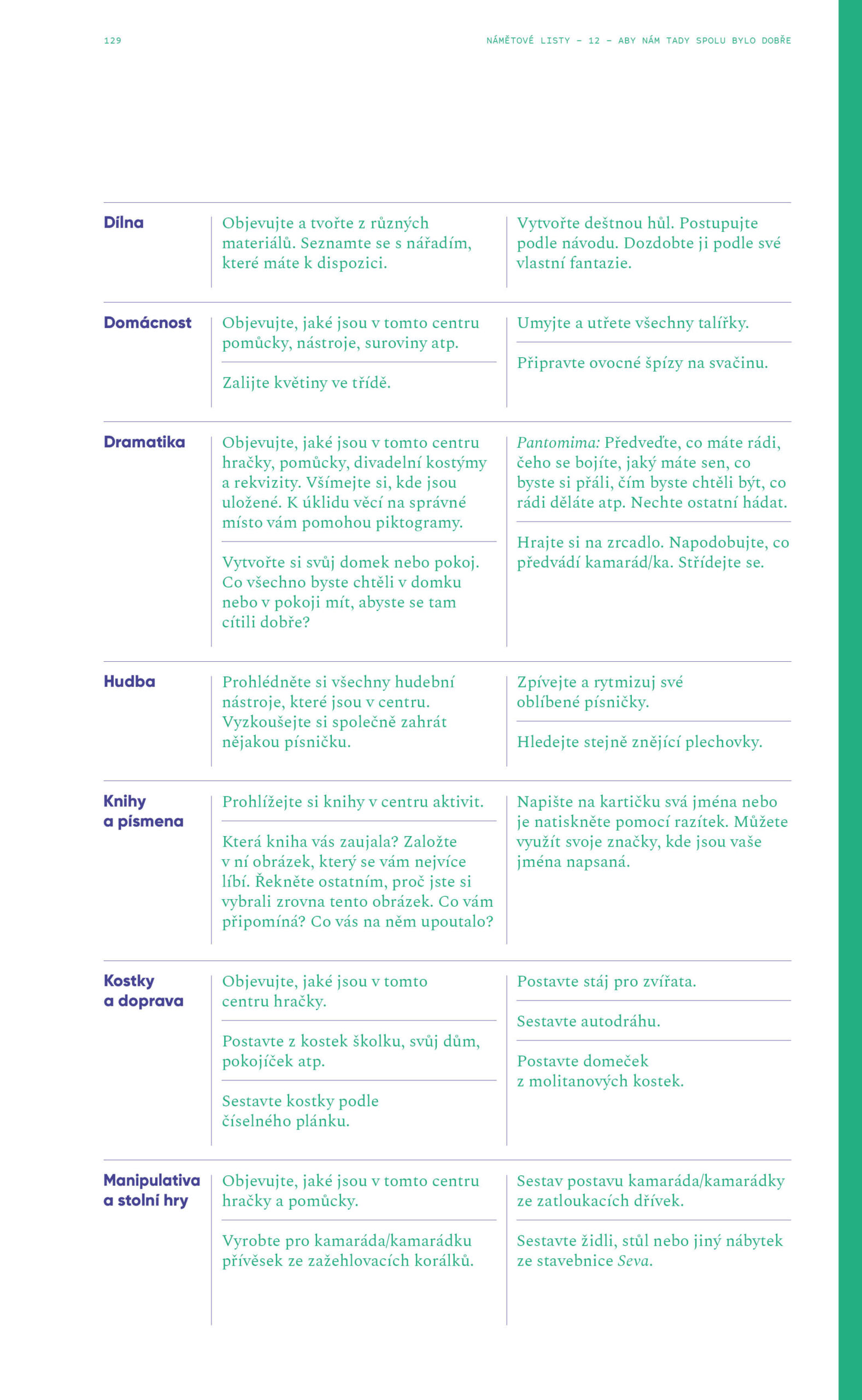 Druhá část obsahuje 20 praktických příkladů zpracovaných do podoby námětových listů (NL). Ty vychází z různých integrovaných tematických bloků, které byly realizované v mateřských školách Začít spolu. Každý NL obsahuje konkrétní příklady, jak rozpracovat jedno téma do všech center aktivit, jak jej propojit s ranními úkoly, činnostmi v ranním kruhu, jak téma přiblížit dětem i mimo MŠ, nabízí možnosti, jak zapojit rodiče atp.