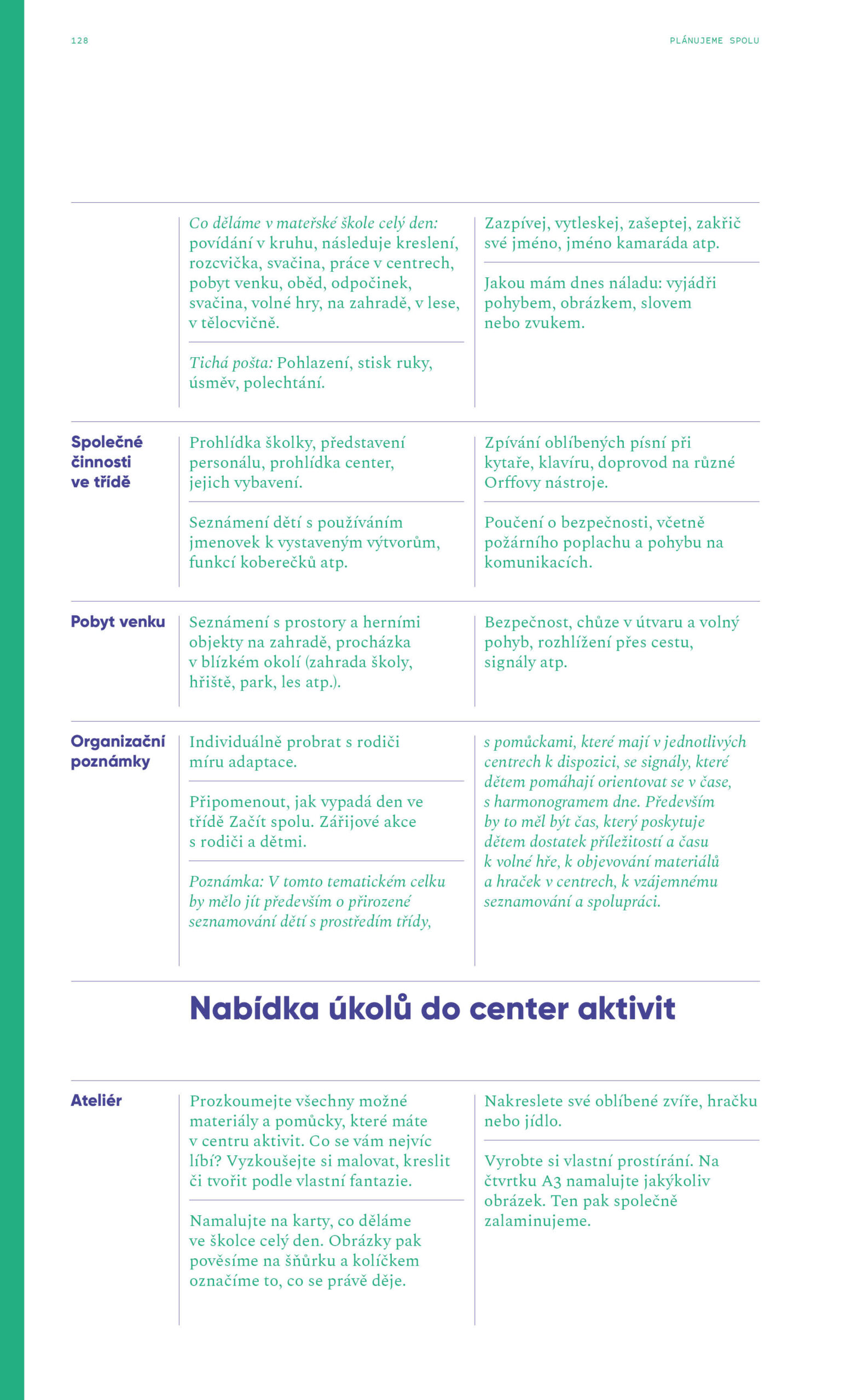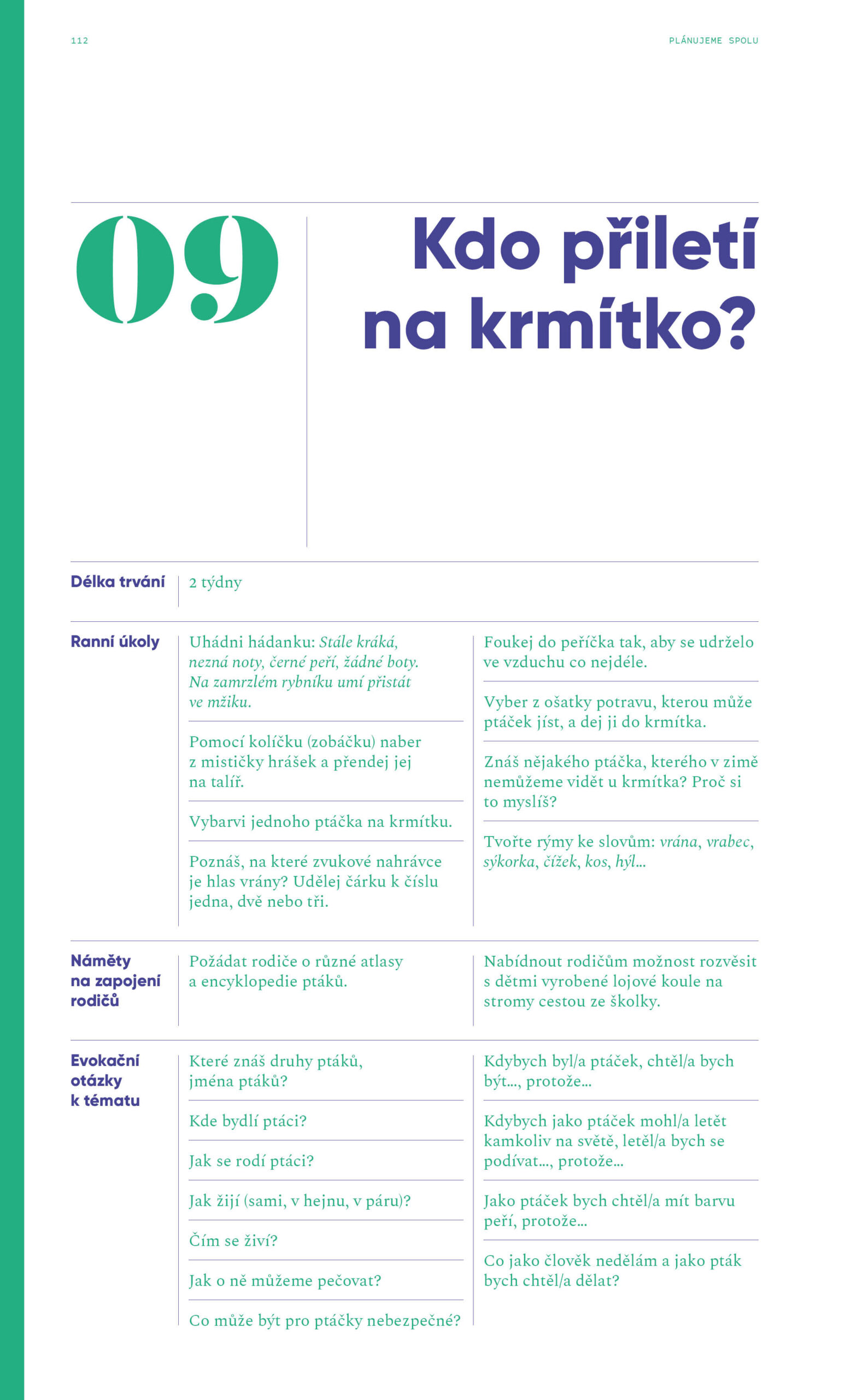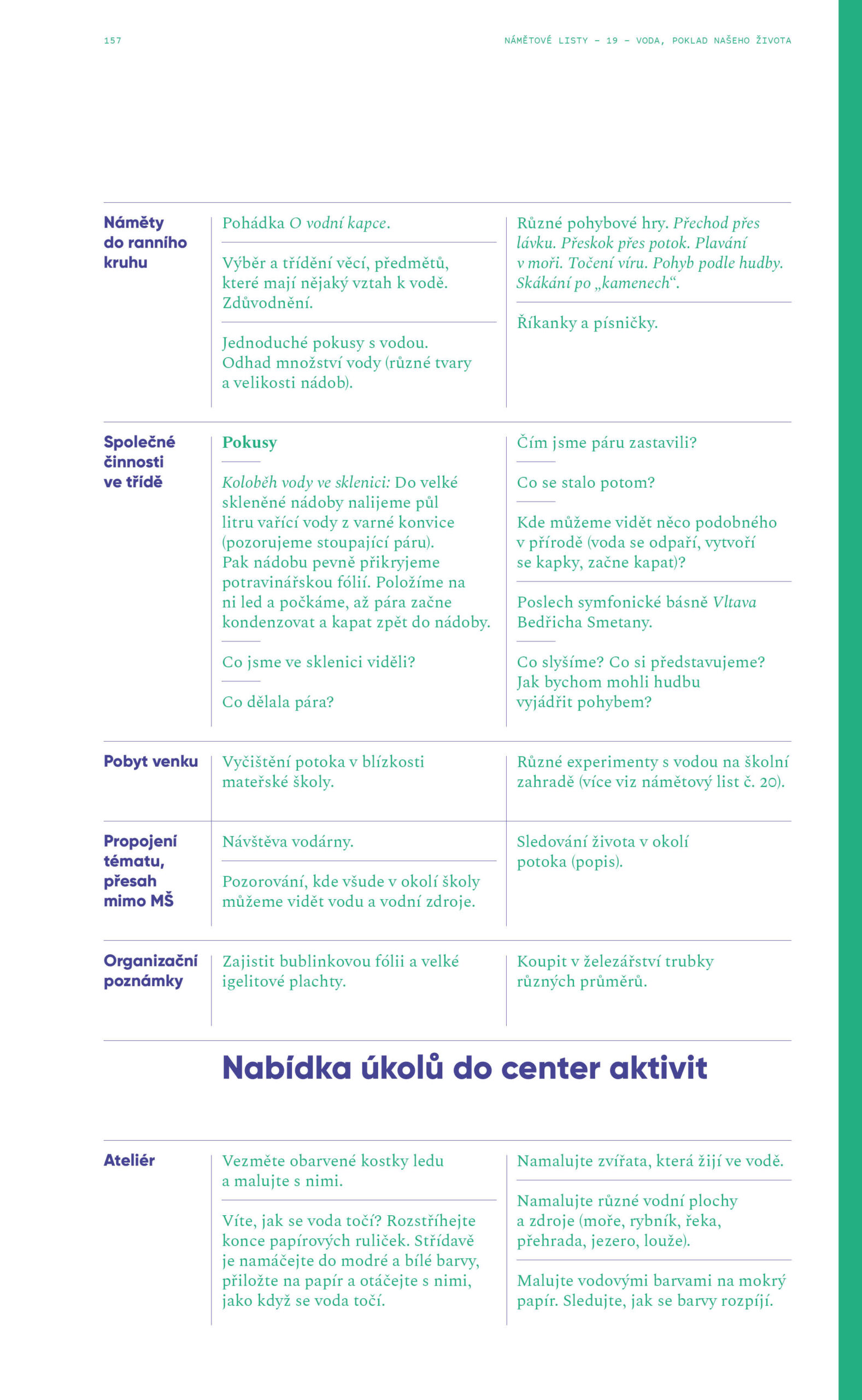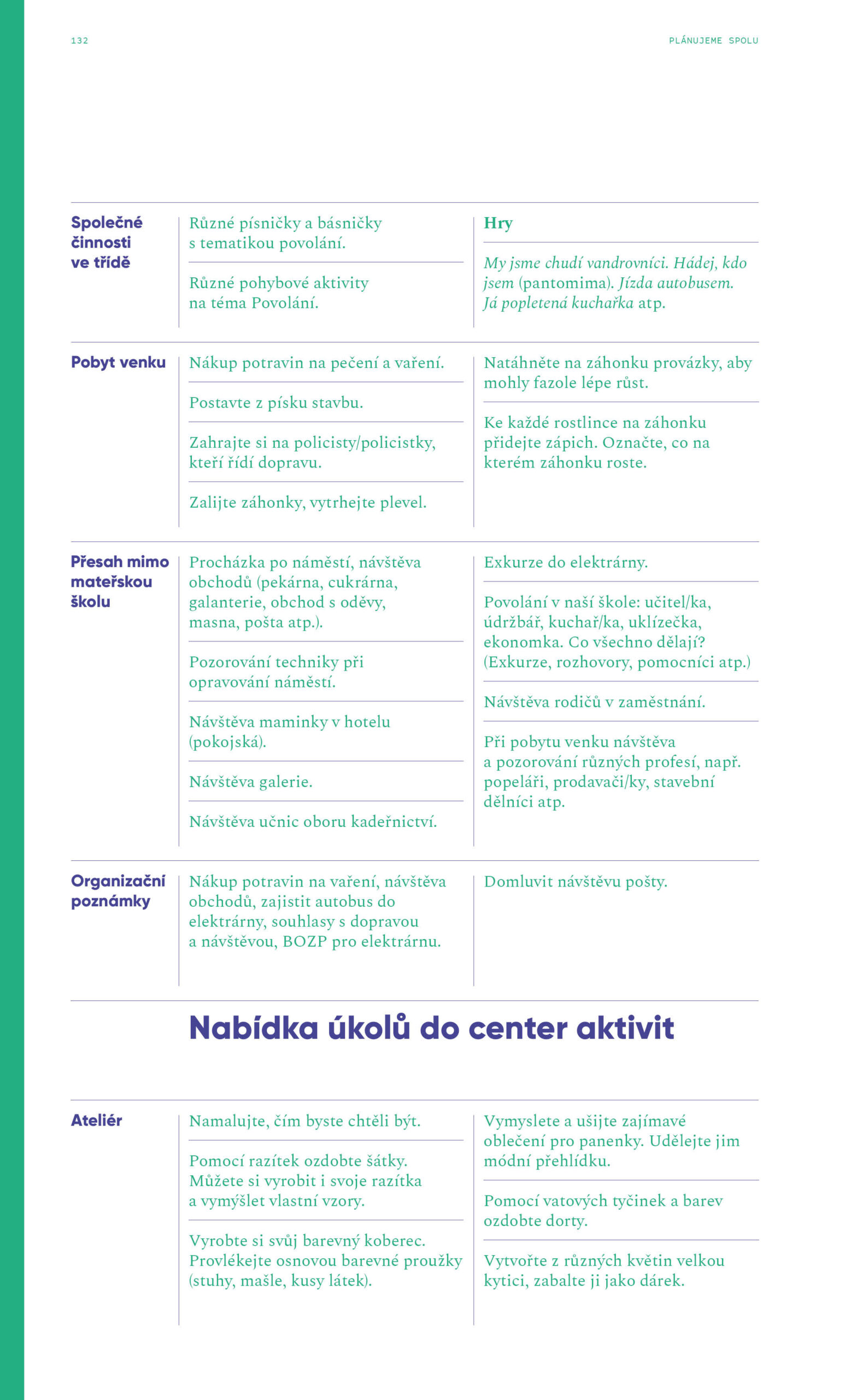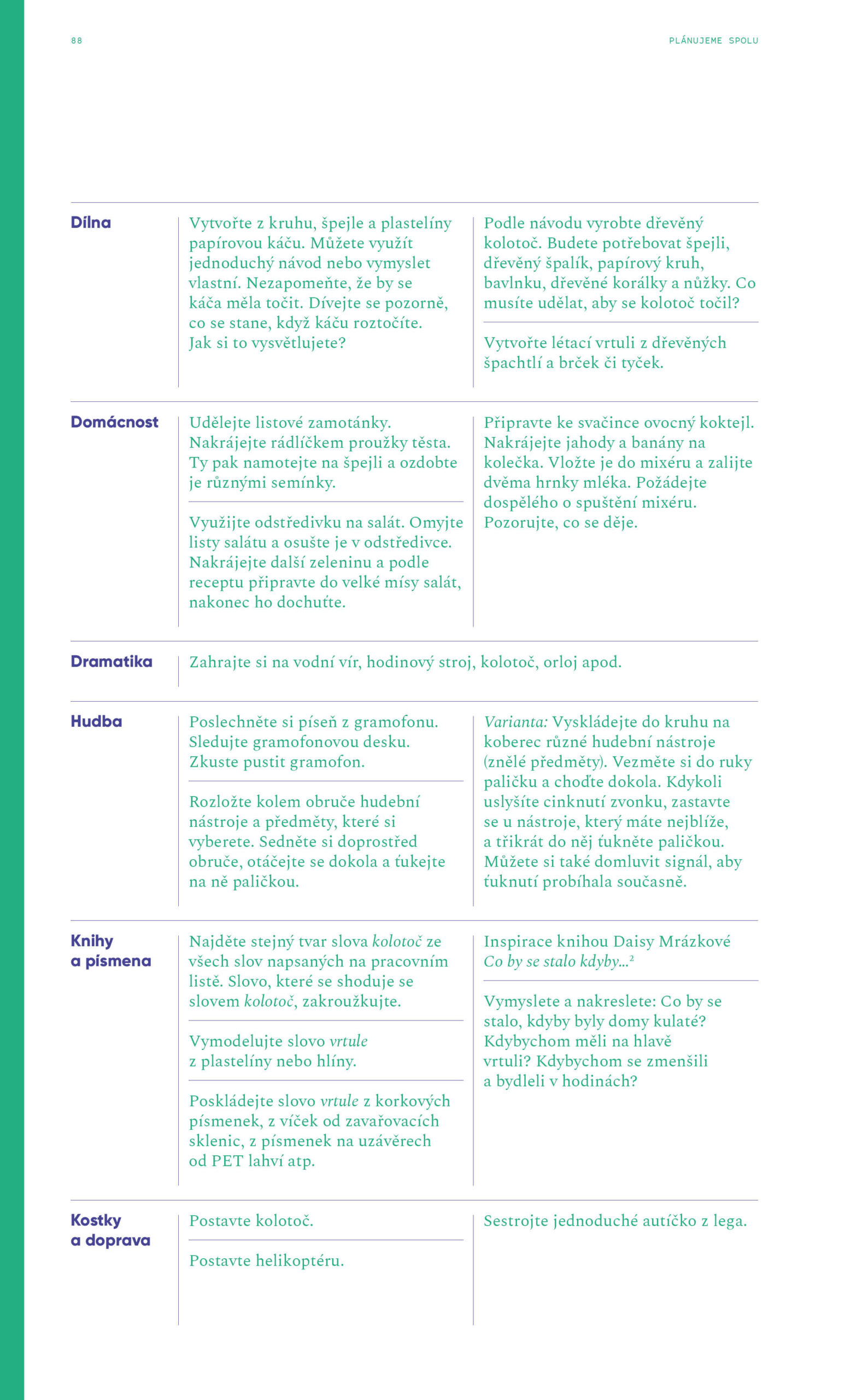 Druhá část obsahuje 20 praktických příkladů zpracovaných do podoby námětových listů (NL). Ty vychází z různých integrovaných tematických bloků, které byly realizované v mateřských školách Začít spolu. Každý NL obsahuje konkrétní příklady, jak rozpracovat jedno téma do všech center aktivit, jak jej propojit s ranními úkoly, činnostmi v ranním kruhu, jak téma přiblížit dětem i mimo MŠ, nabízí možnosti, jak zapojit rodiče atp.