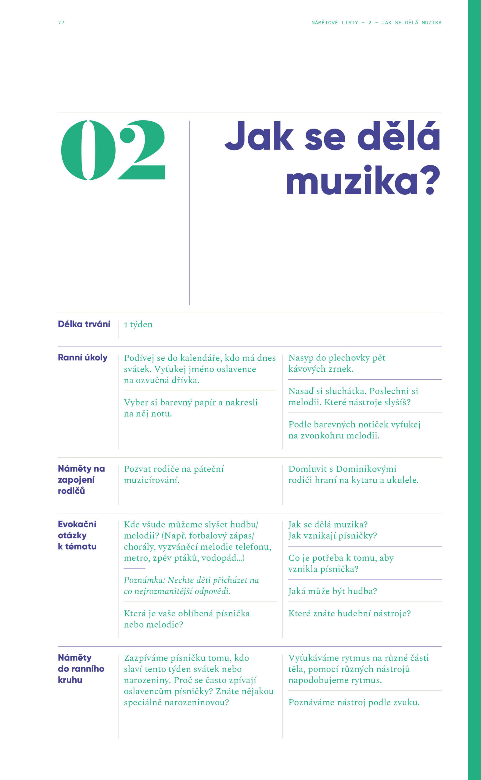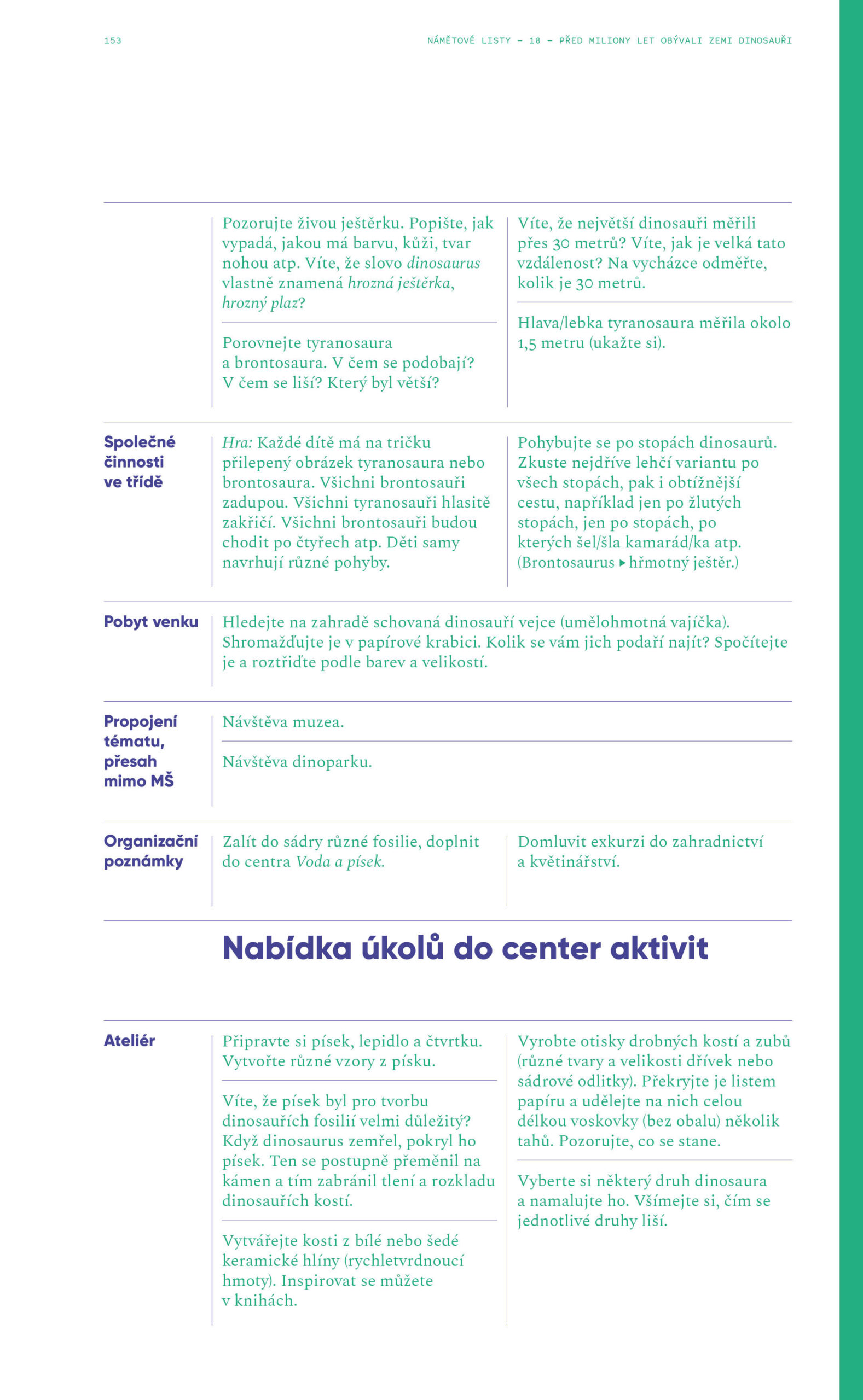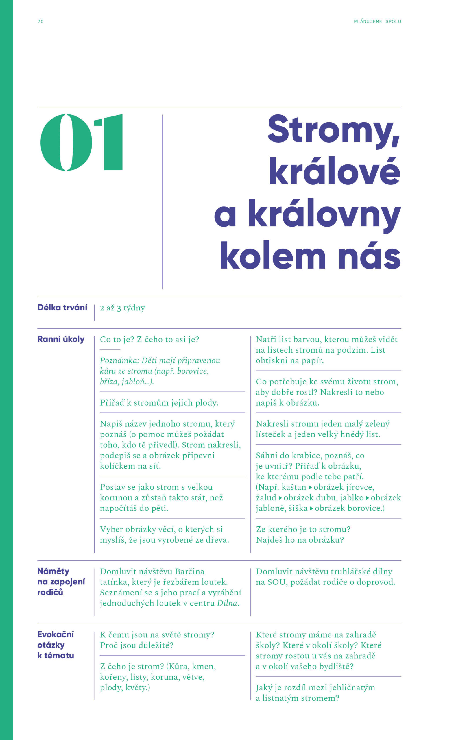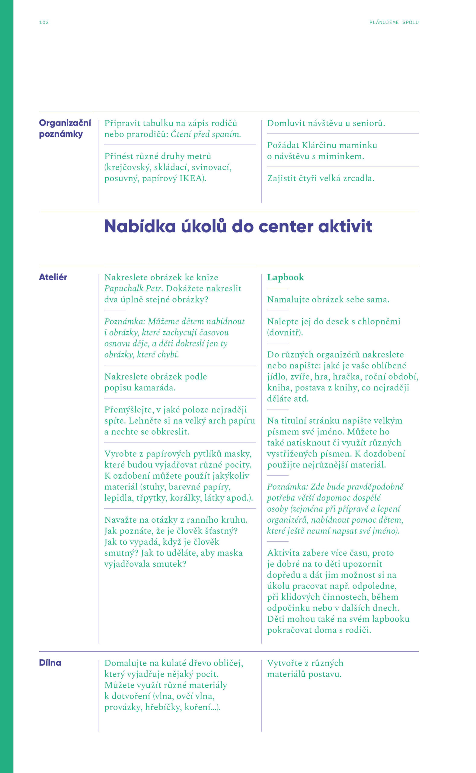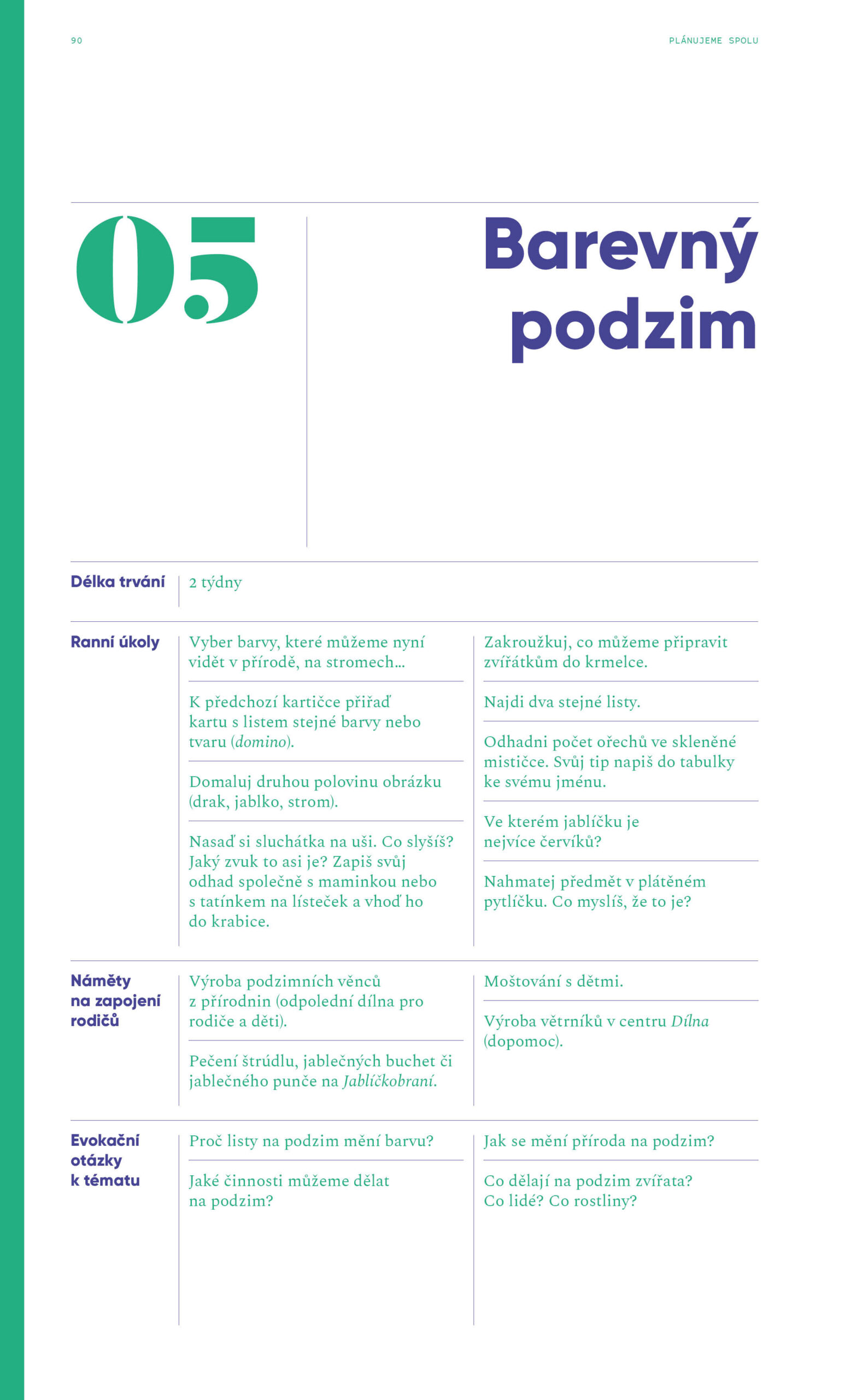 Druhá část obsahuje 20 praktických příkladů zpracovaných do podoby námětových listů (NL). Ty vychází z různých integrovaných tematických bloků, které byly realizované v mateřských školách Začít spolu. Každý NL obsahuje konkrétní příklady, jak rozpracovat jedno téma do všech center aktivit, jak jej propojit s ranními úkoly, činnostmi v ranním kruhu, jak téma přiblížit dětem i mimo MŠ, nabízí možnosti, jak zapojit rodiče atp.