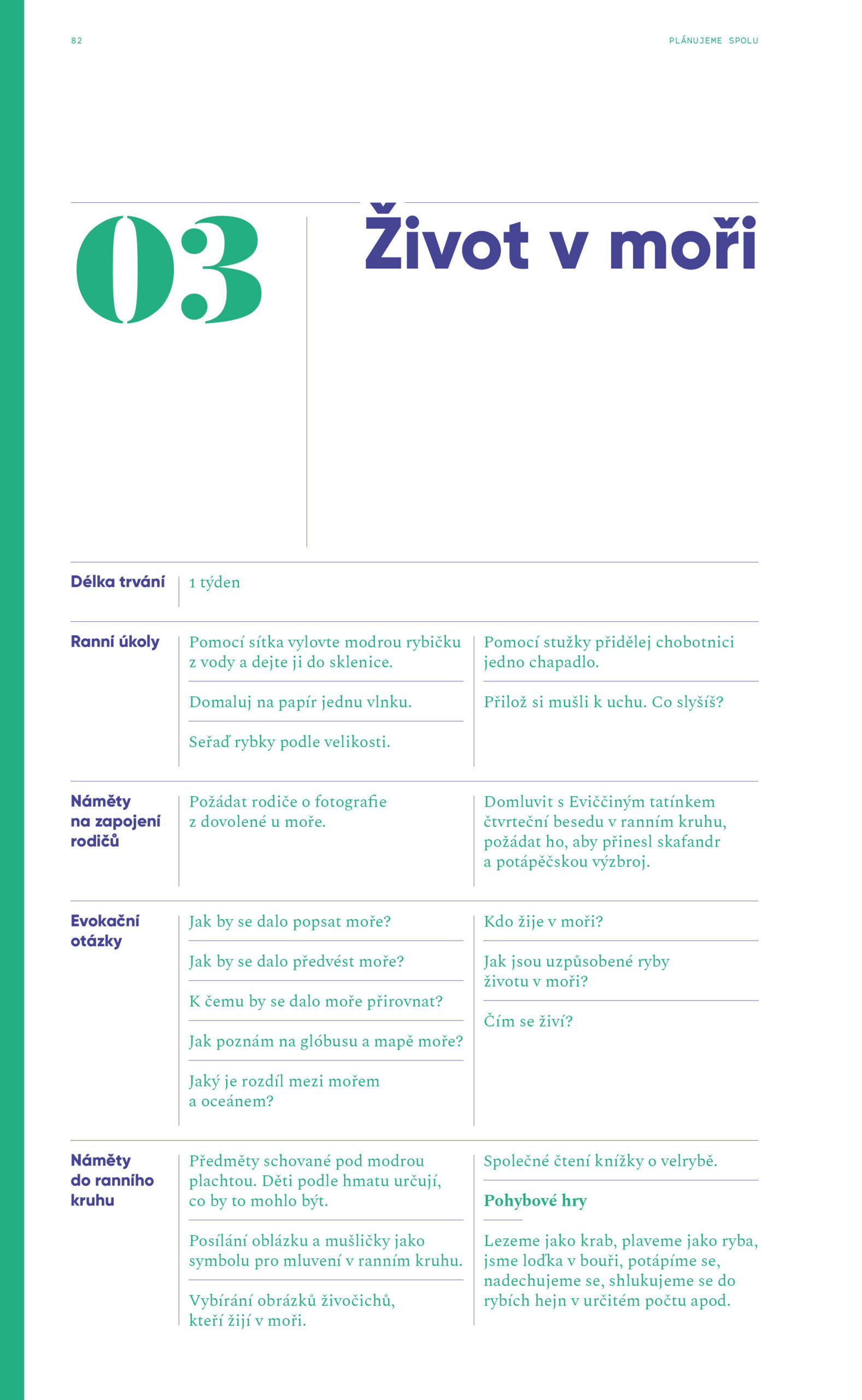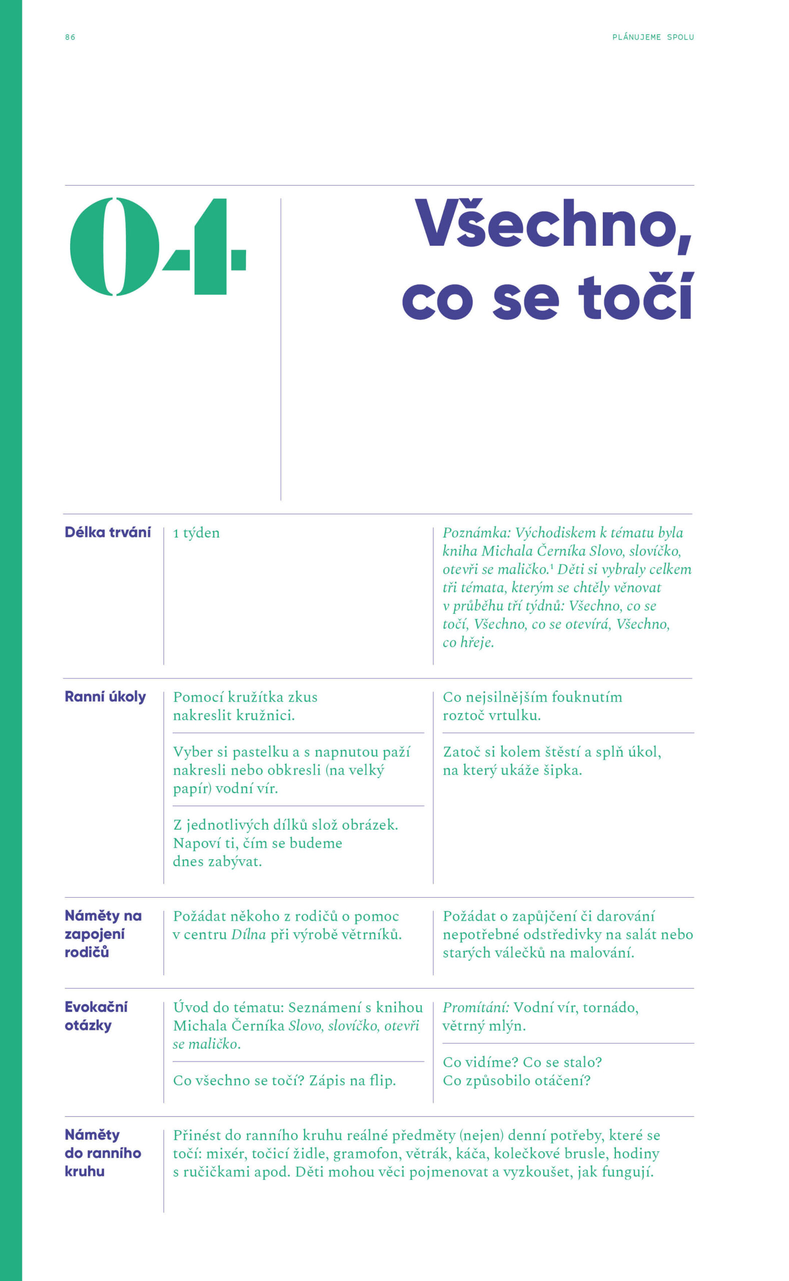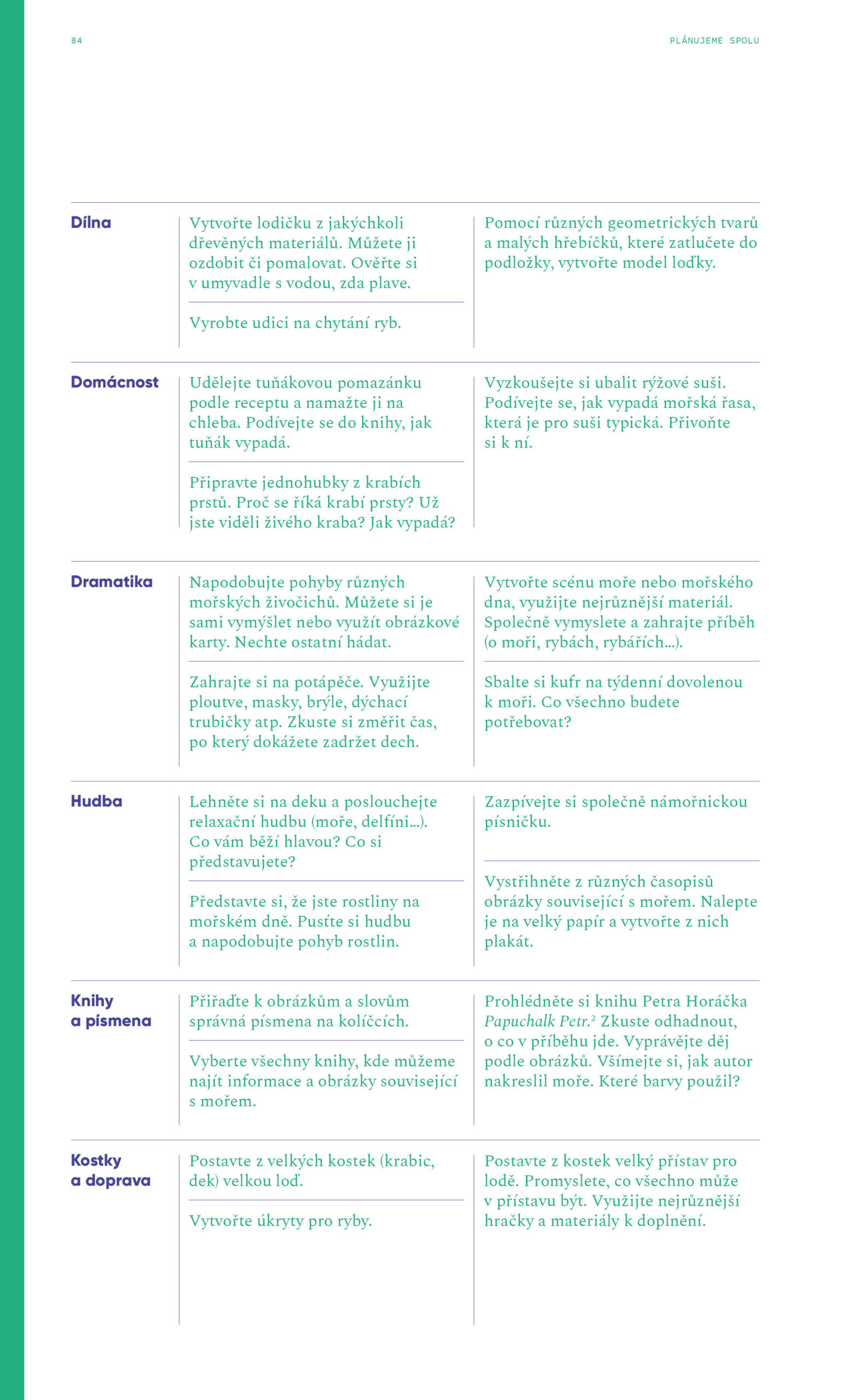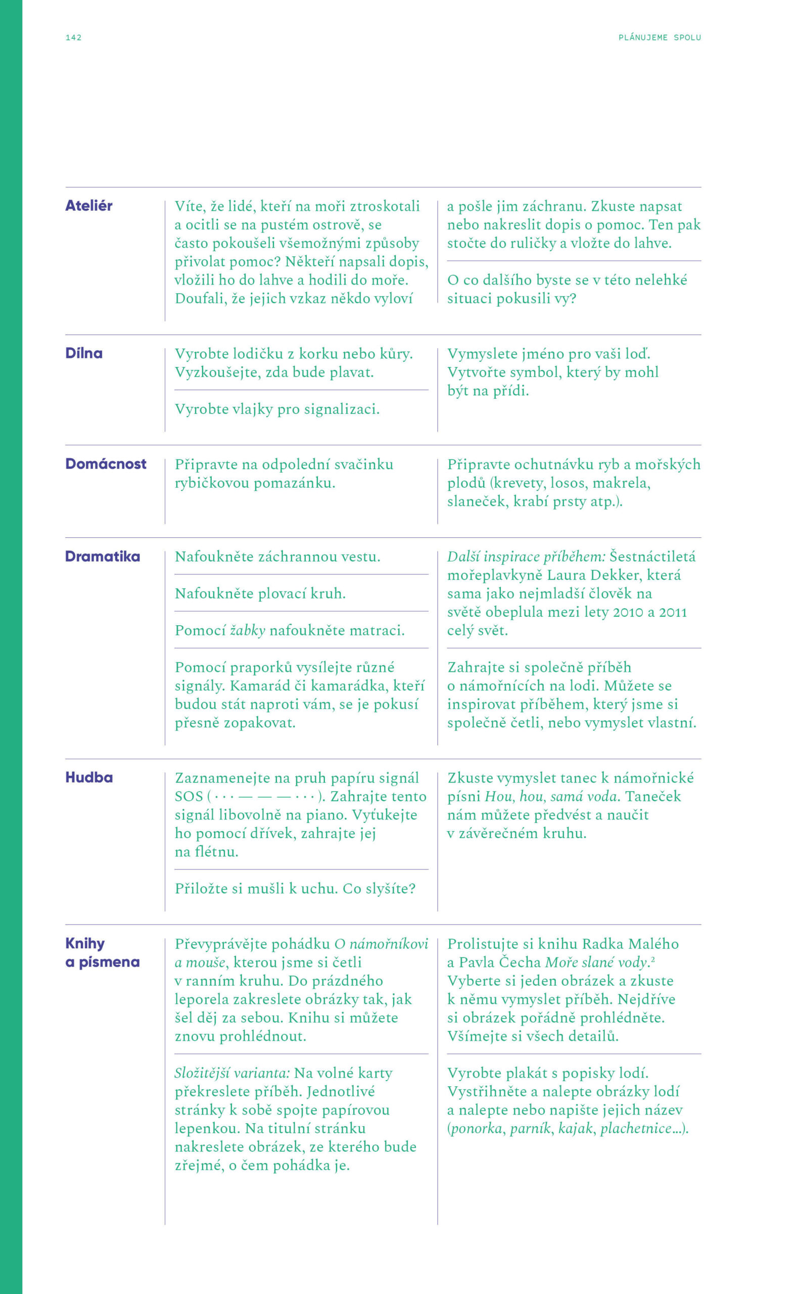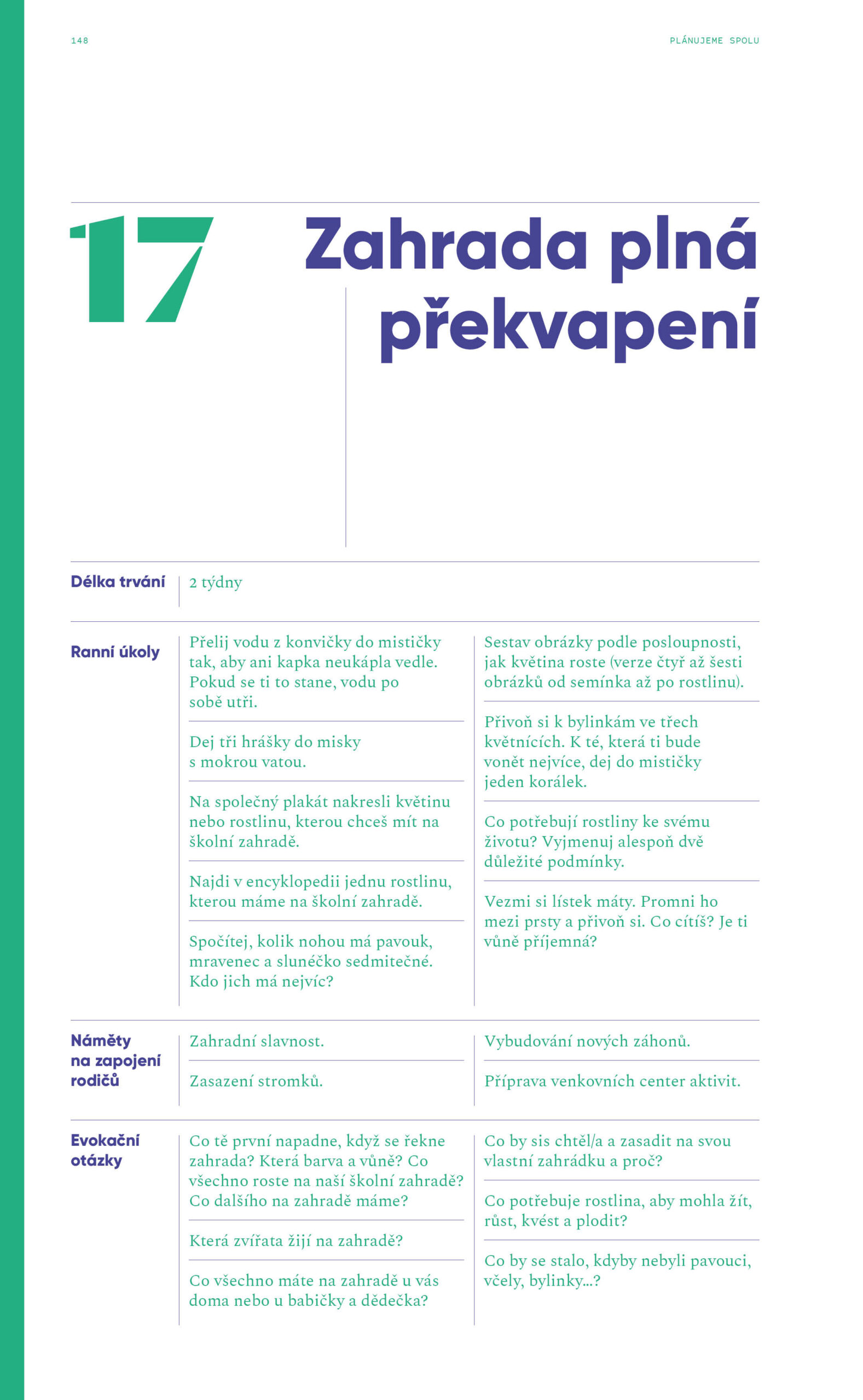Druhá část obsahuje 20 praktických příkladů zpracovaných do podoby námětových listů (NL). Ty vychází z různých integrovaných tematických bloků, které byly realizované v mateřských školách Začít spolu. Každý NL obsahuje konkrétní příklady, jak rozpracovat jedno téma do všech center aktivit, jak jej propojit s ranními úkoly, činnostmi v ranním kruhu, jak téma přiblížit dětem i mimo MŠ, nabízí možnosti, jak zapojit rodiče atp.