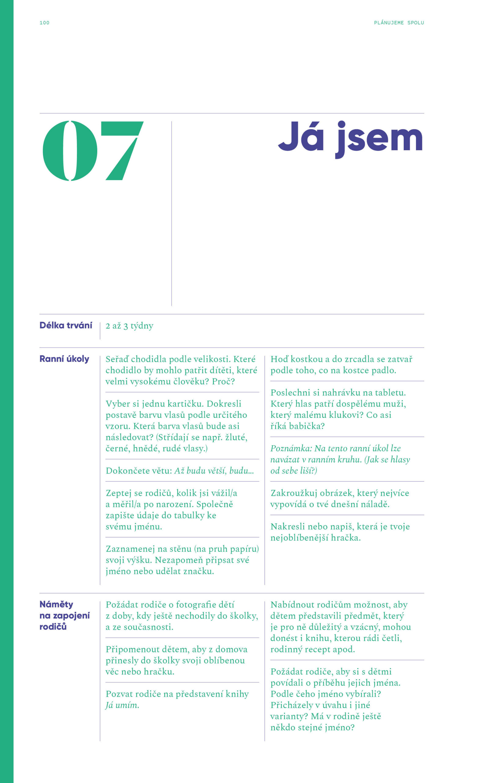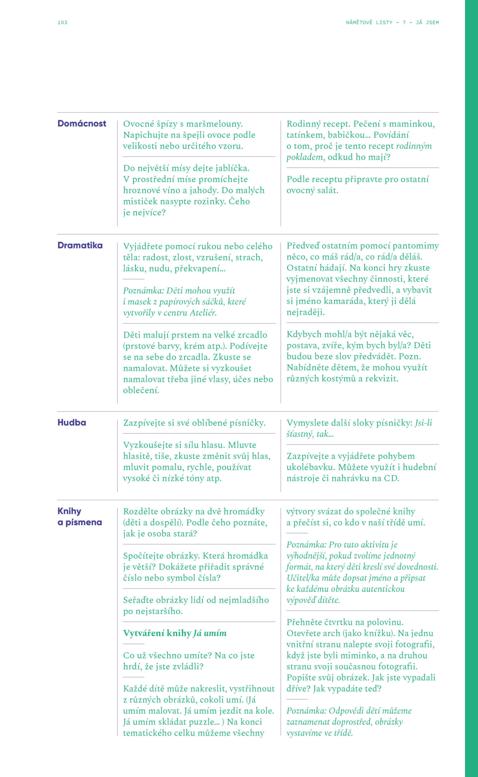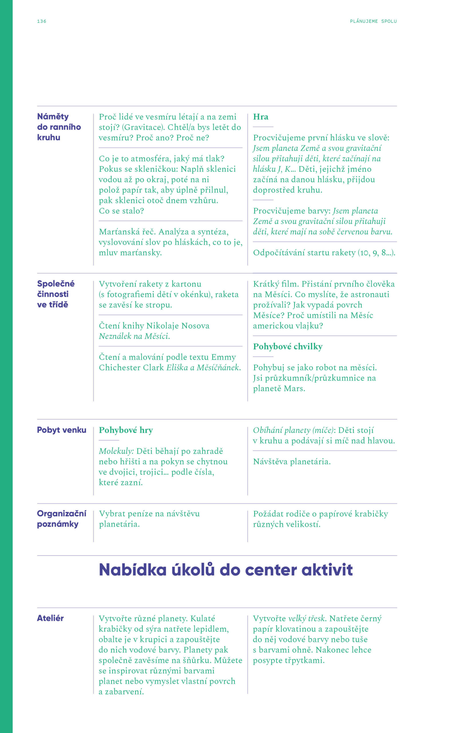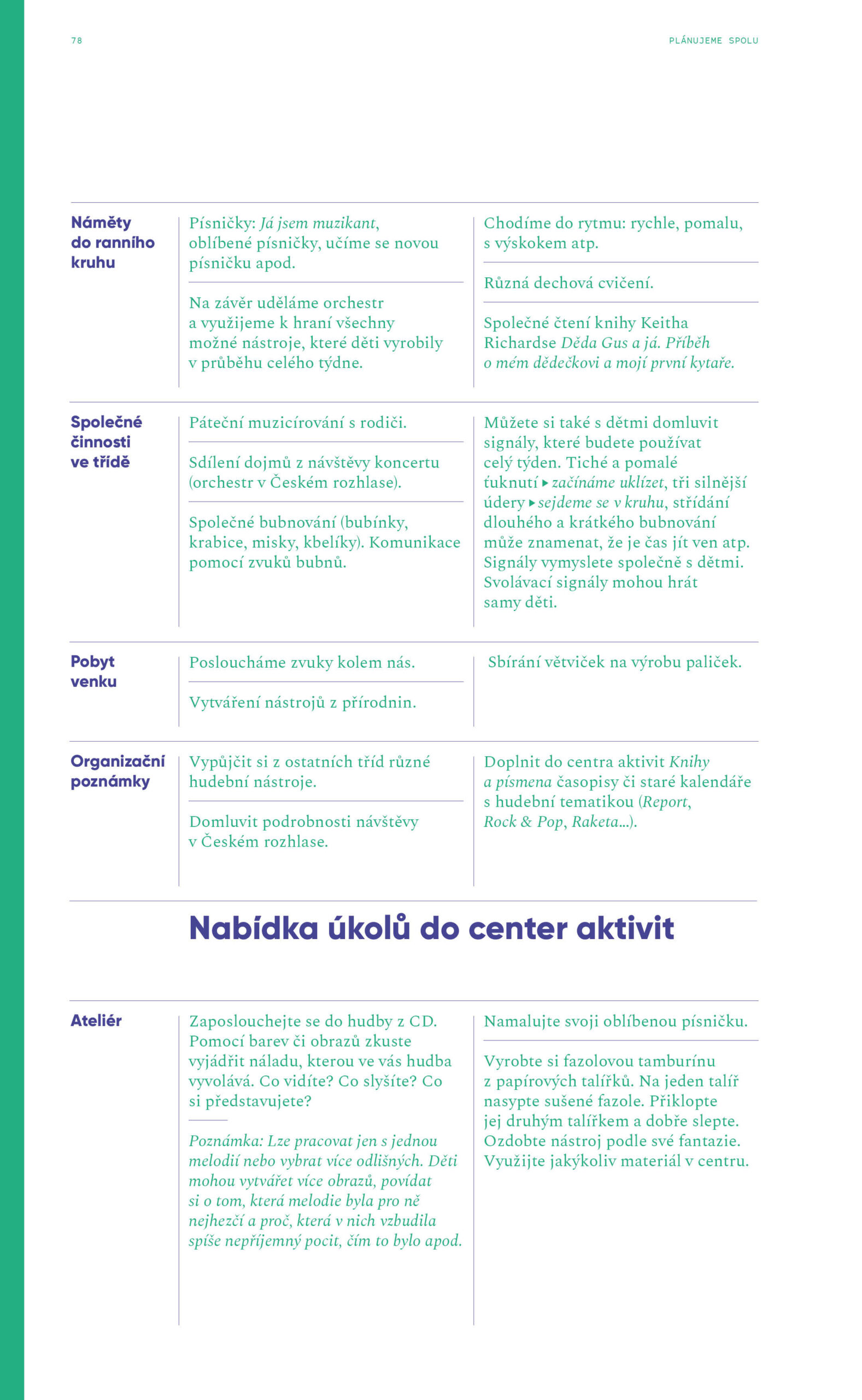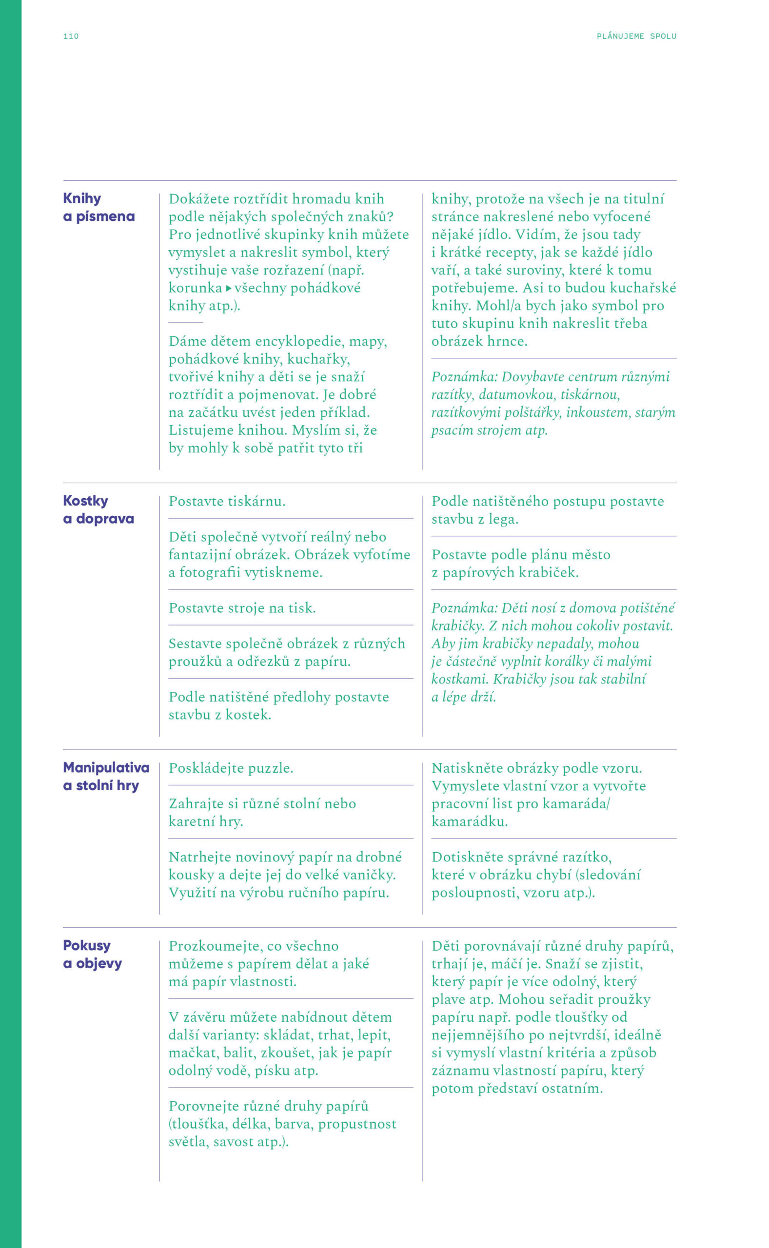 Druhá část obsahuje 20 praktických příkladů zpracovaných do podoby námětových listů (NL). Ty vychází z různých integrovaných tematických bloků, které byly realizované v mateřských školách Začít spolu. Každý NL obsahuje konkrétní příklady, jak rozpracovat jedno téma do všech center aktivit, jak jej propojit s ranními úkoly, činnostmi v ranním kruhu, jak téma přiblížit dětem i mimo MŠ, nabízí možnosti, jak zapojit rodiče atp.