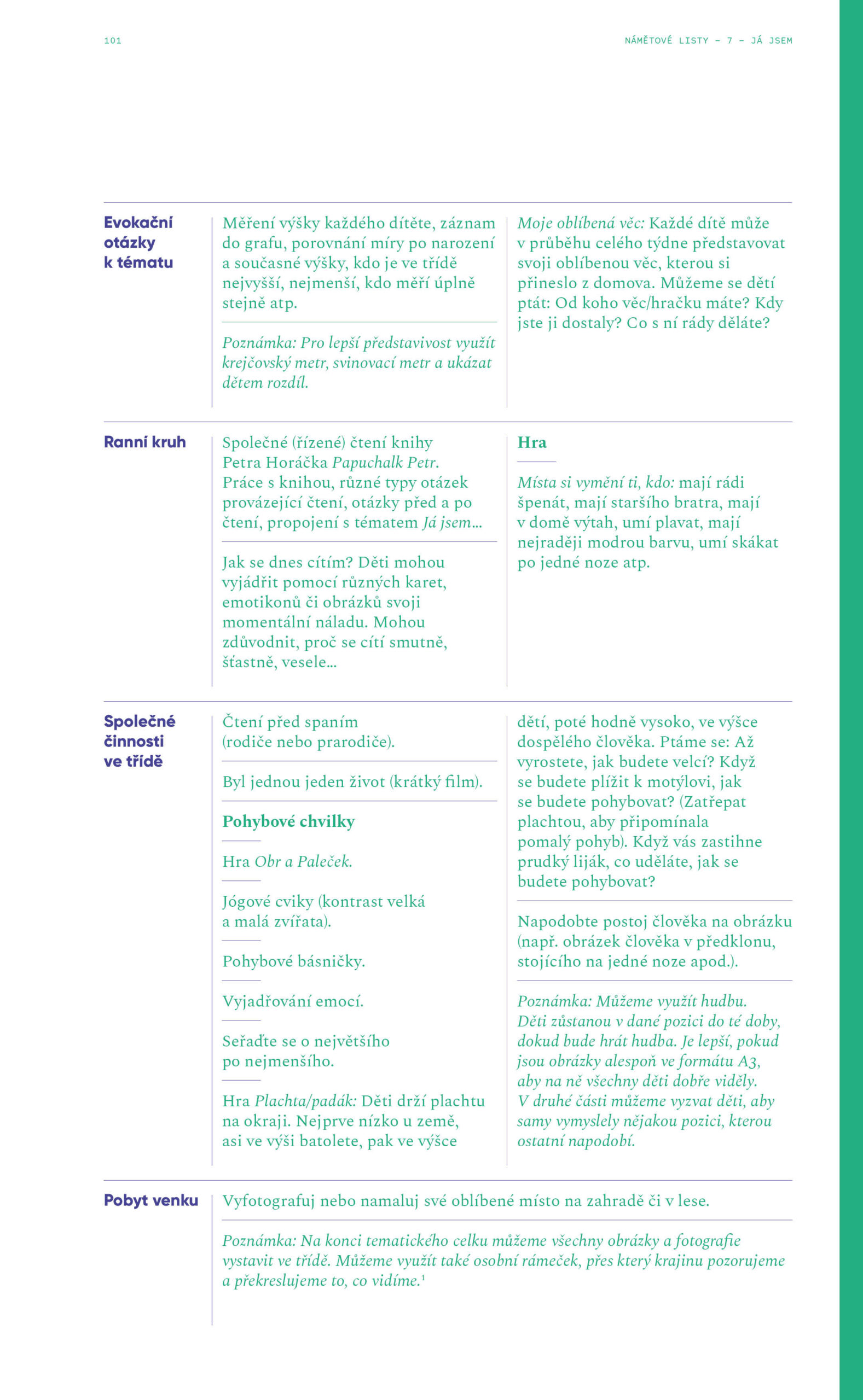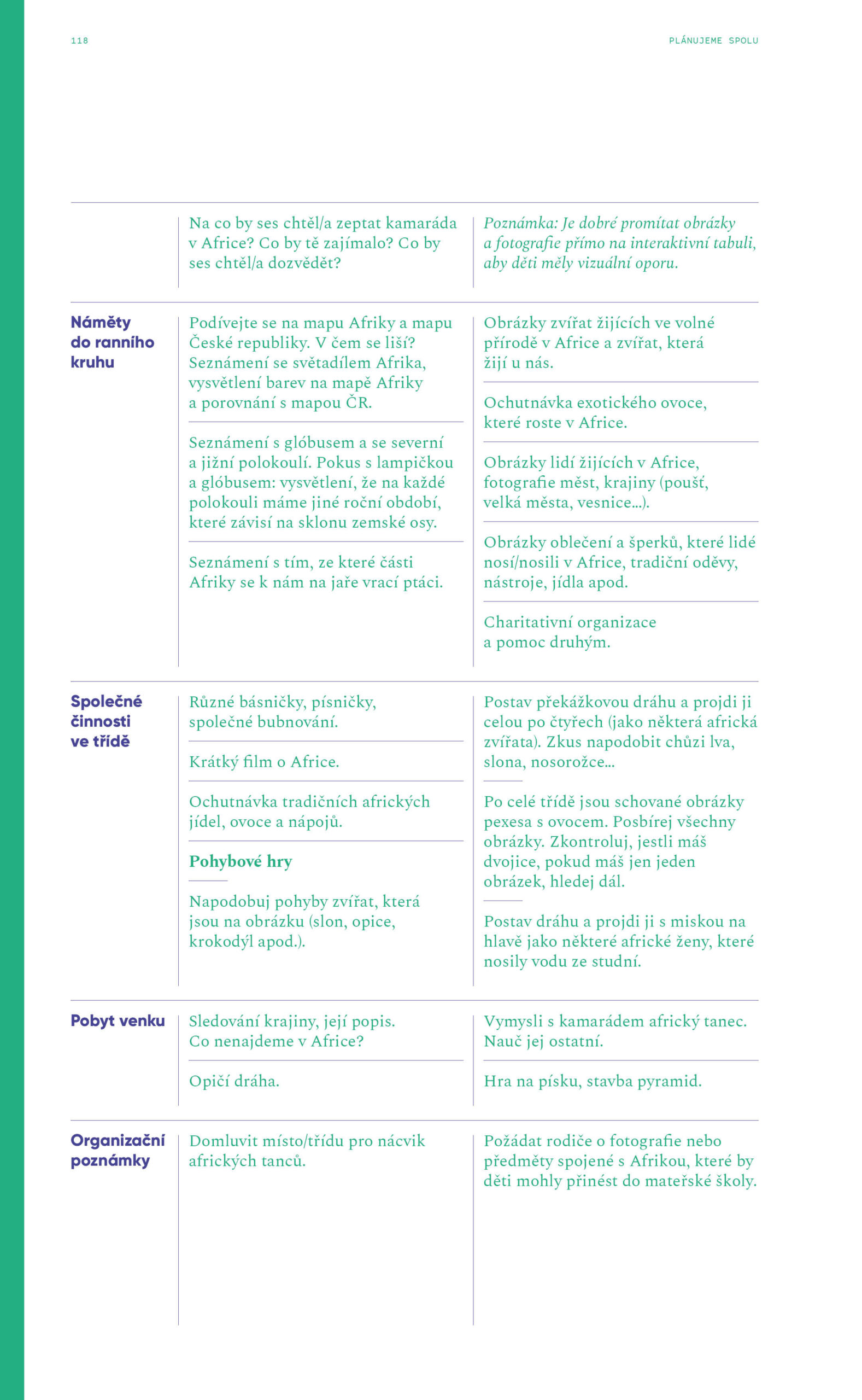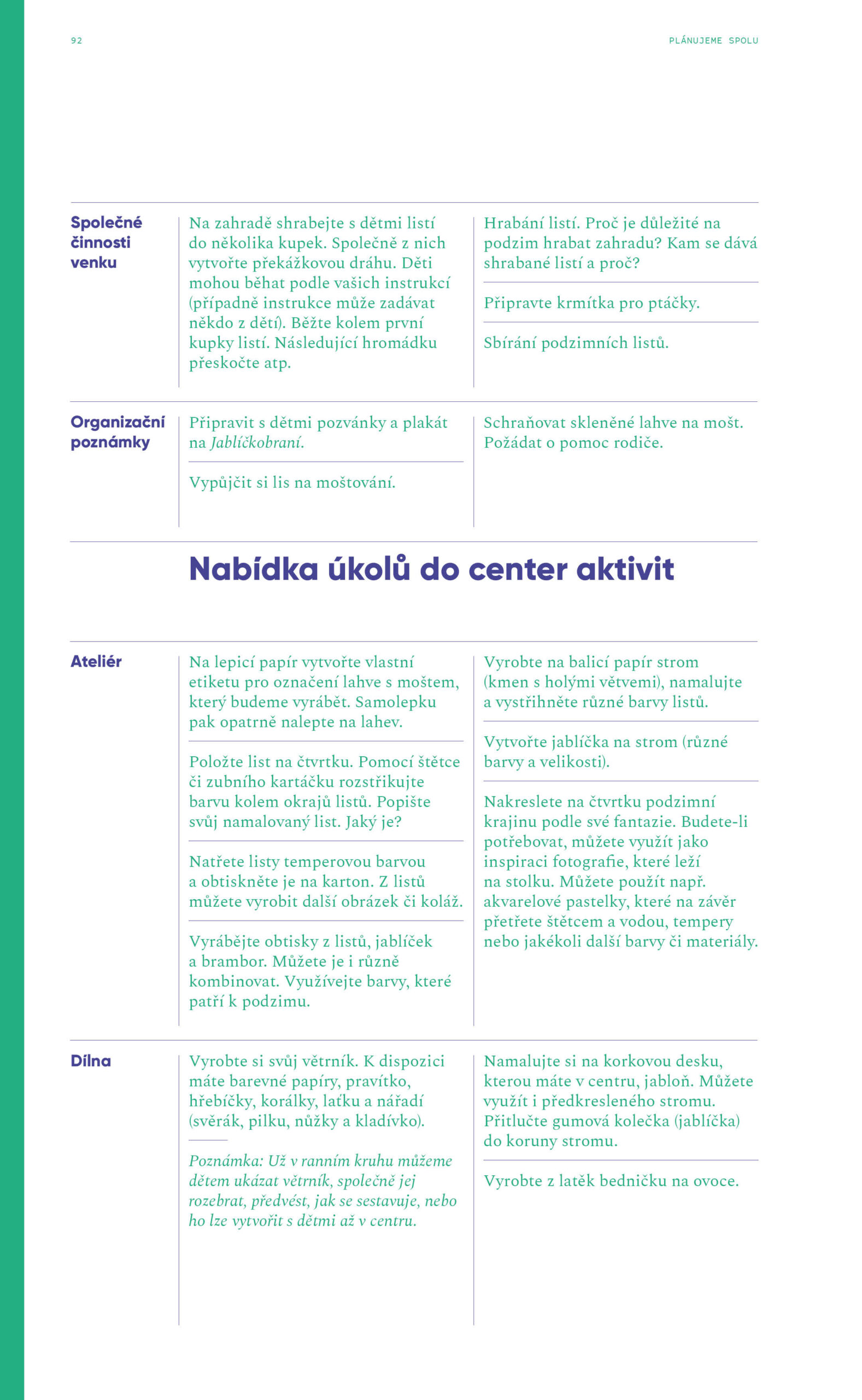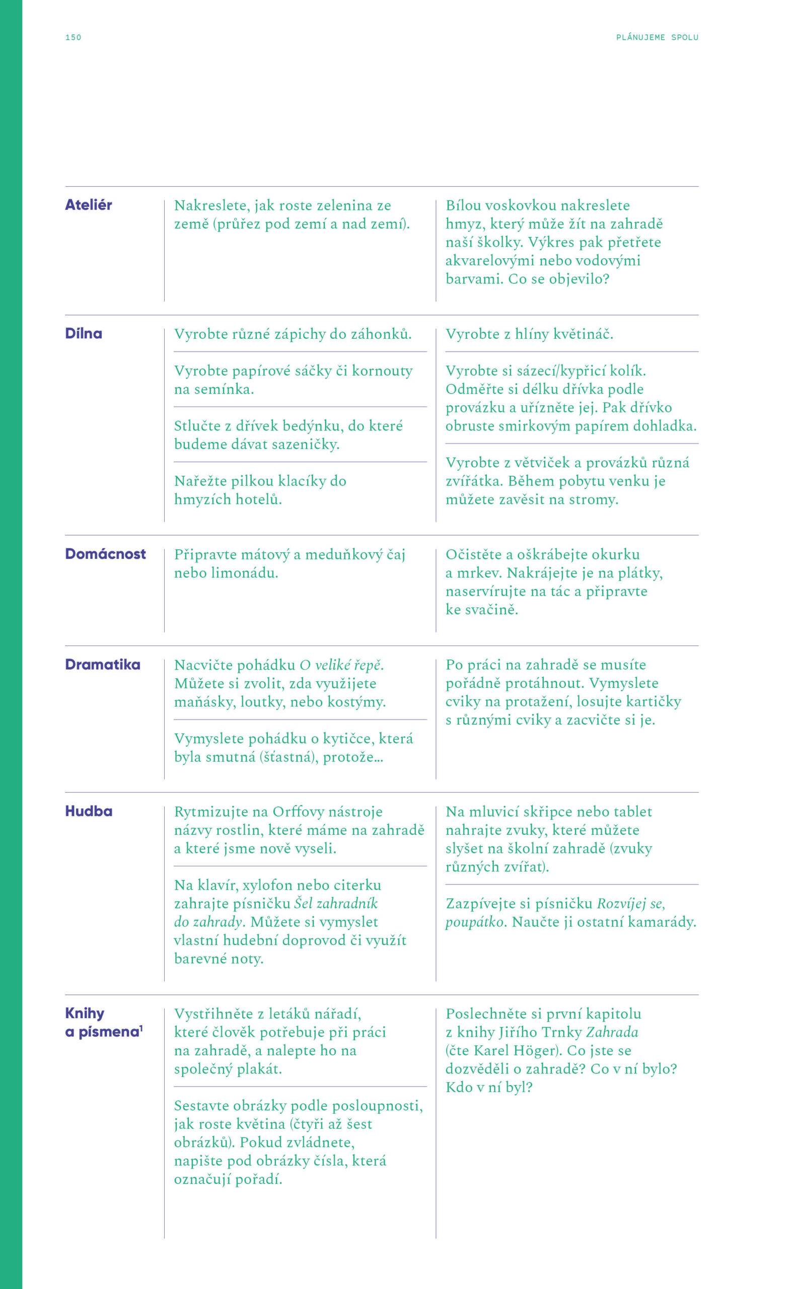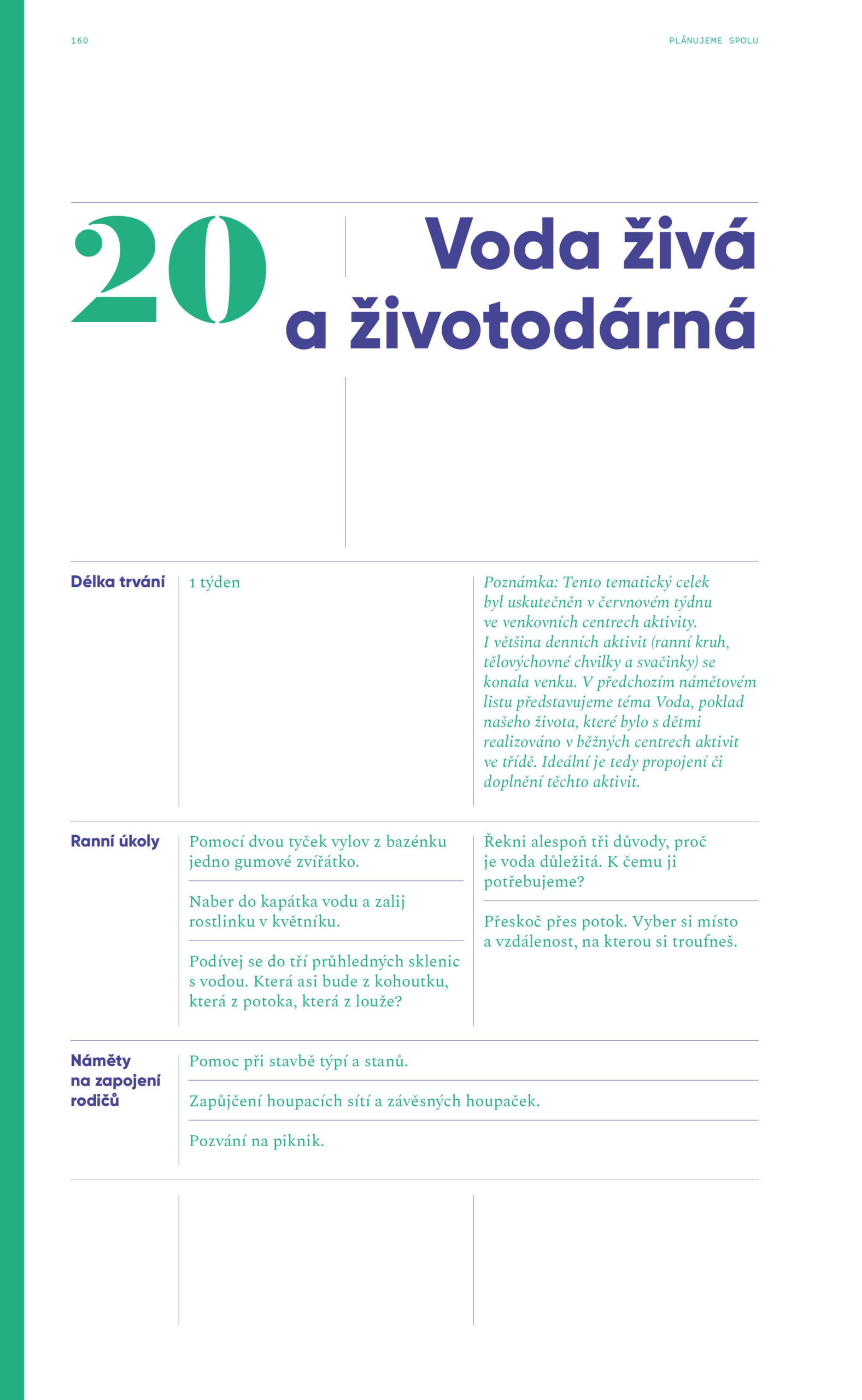 Druhá část obsahuje 20 praktických příkladů zpracovaných do podoby námětových listů (NL). Ty vychází z různých integrovaných tematických bloků, které byly realizované v mateřských školách Začít spolu. Každý NL obsahuje konkrétní příklady, jak rozpracovat jedno téma do všech center aktivit, jak jej propojit s ranními úkoly, činnostmi v ranním kruhu, jak téma přiblížit dětem i mimo MŠ, nabízí možnosti, jak zapojit rodiče atp.