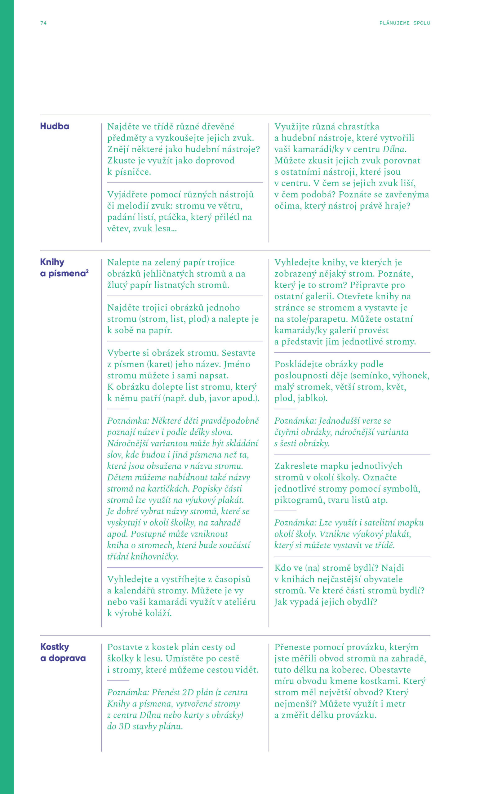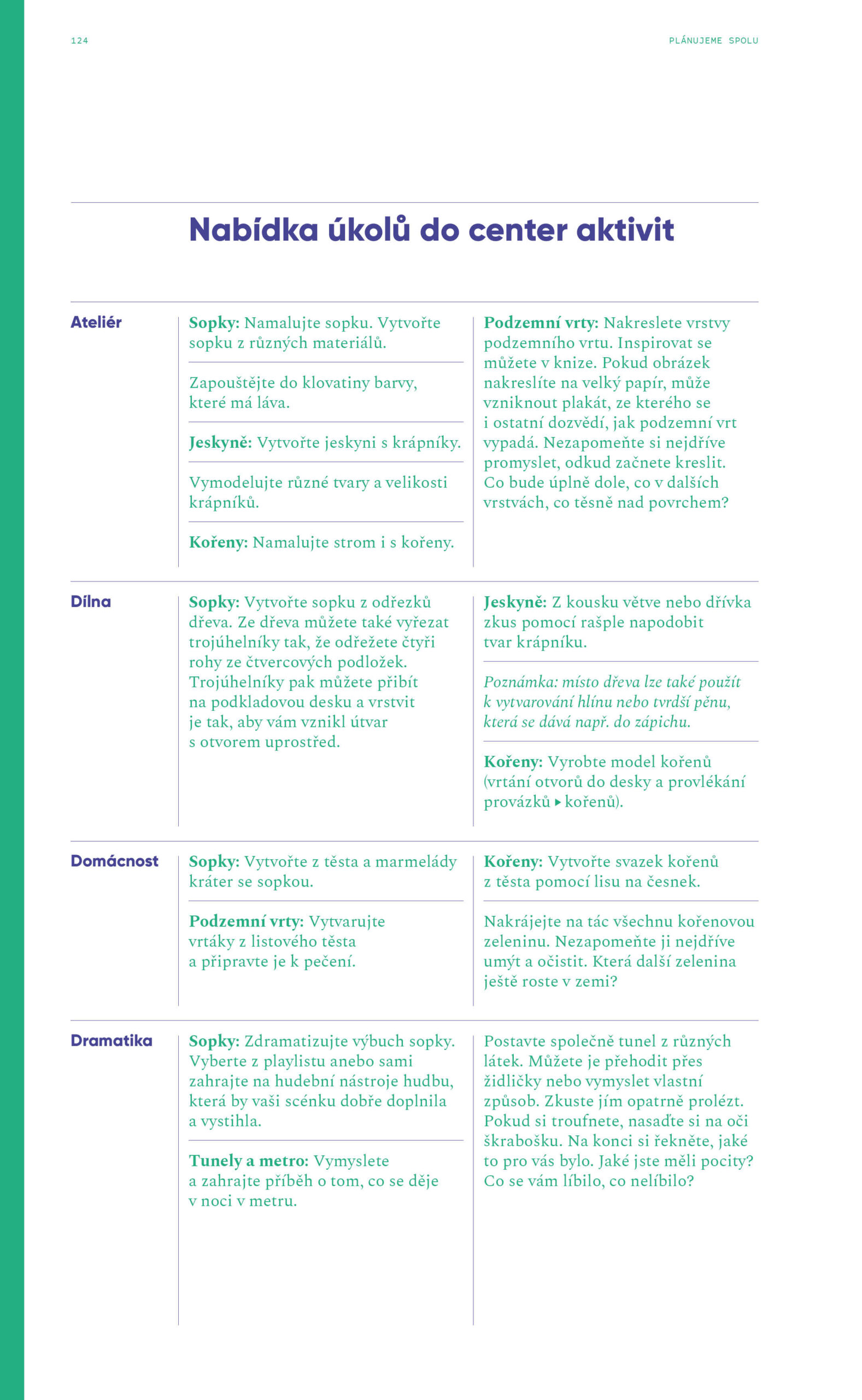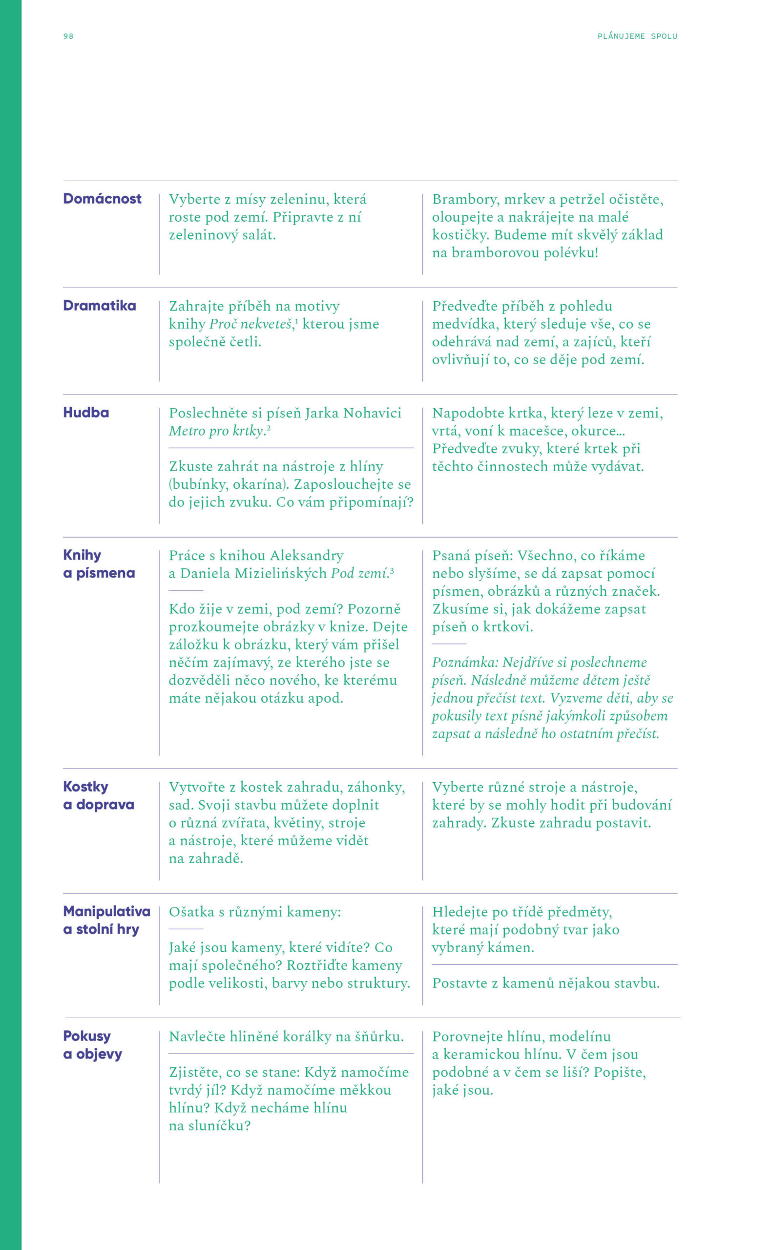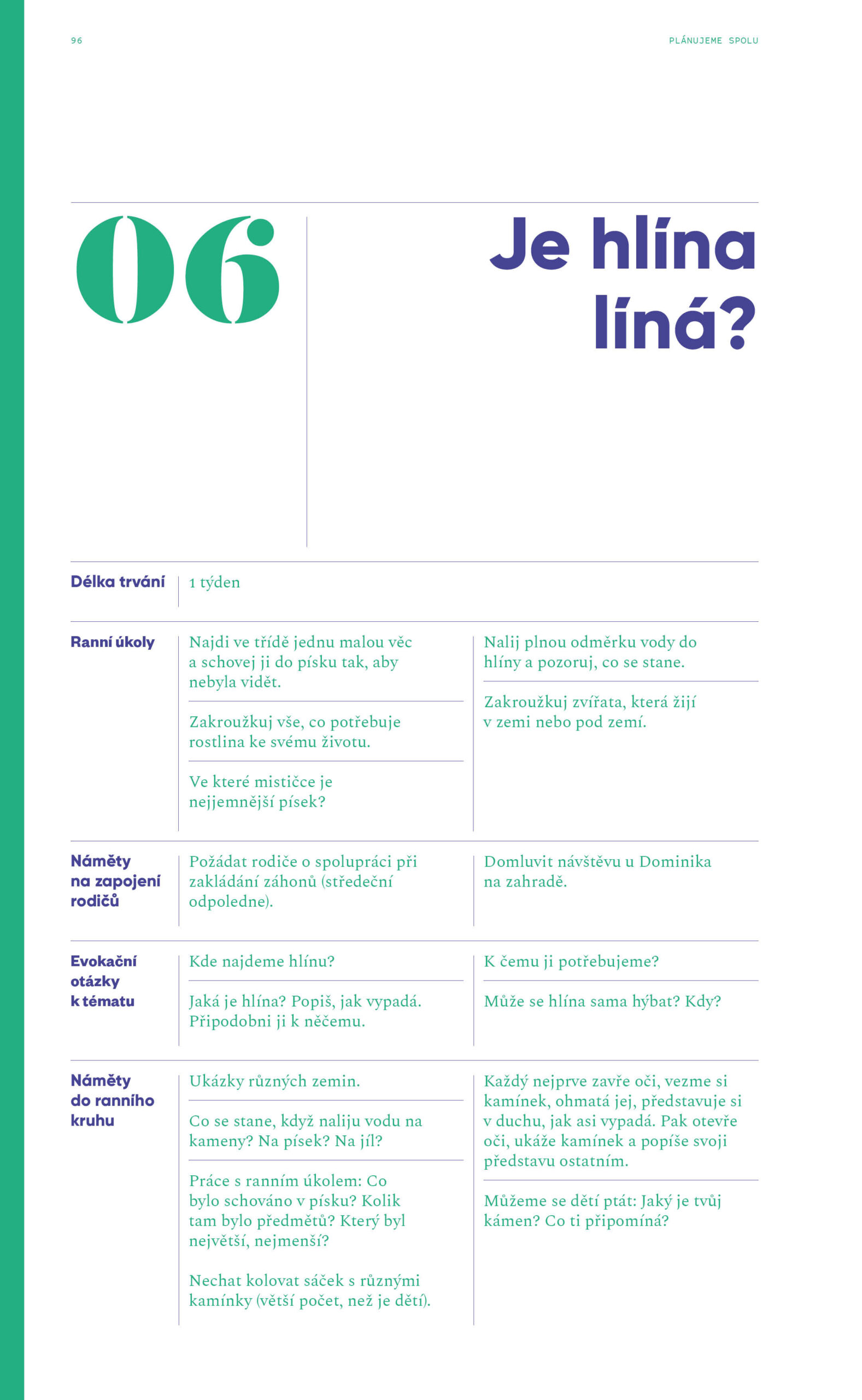Druhá část obsahuje 20 praktických příkladů zpracovaných do podoby námětových listů (NL). Ty vychází z různých integrovaných tematických bloků, které byly realizované v mateřských školách Začít spolu. Každý NL obsahuje konkrétní příklady, jak rozpracovat jedno téma do všech center aktivit, jak jej propojit s ranními úkoly, činnostmi v ranním kruhu, jak téma přiblížit dětem i mimo MŠ, nabízí možnosti, jak zapojit rodiče atp.