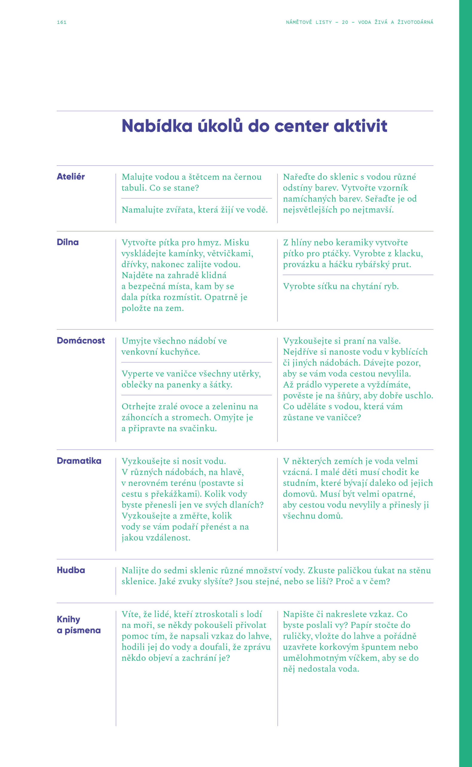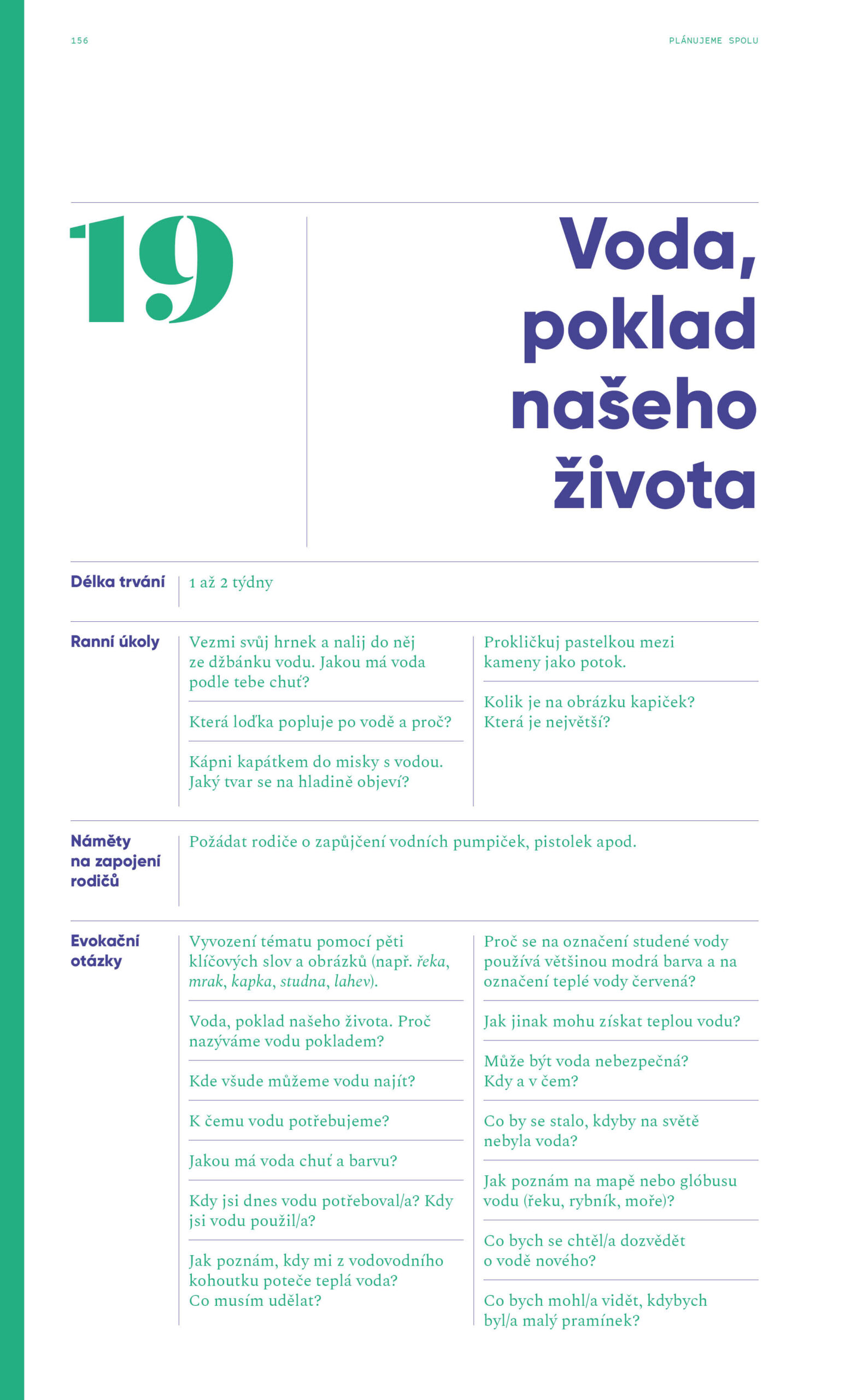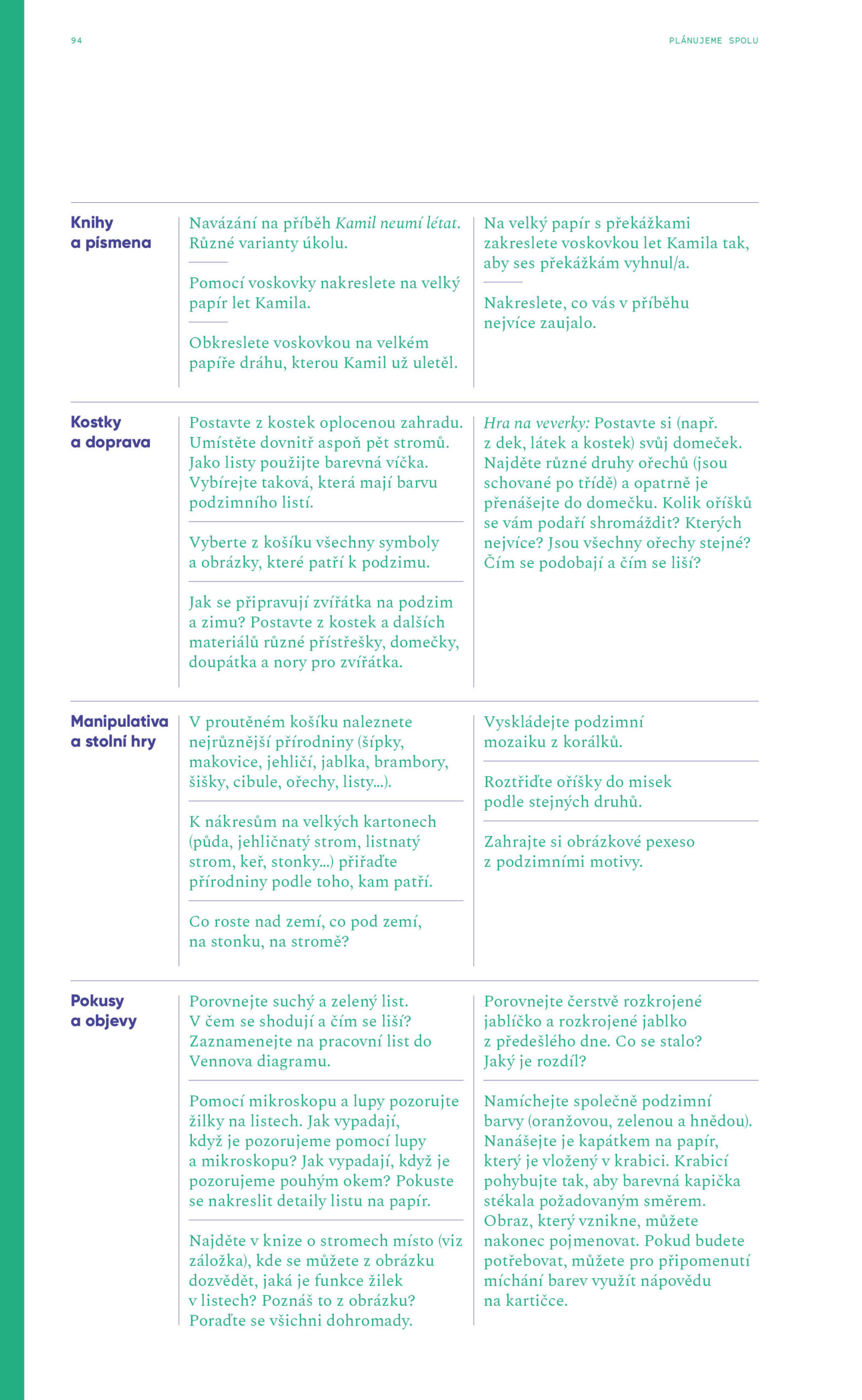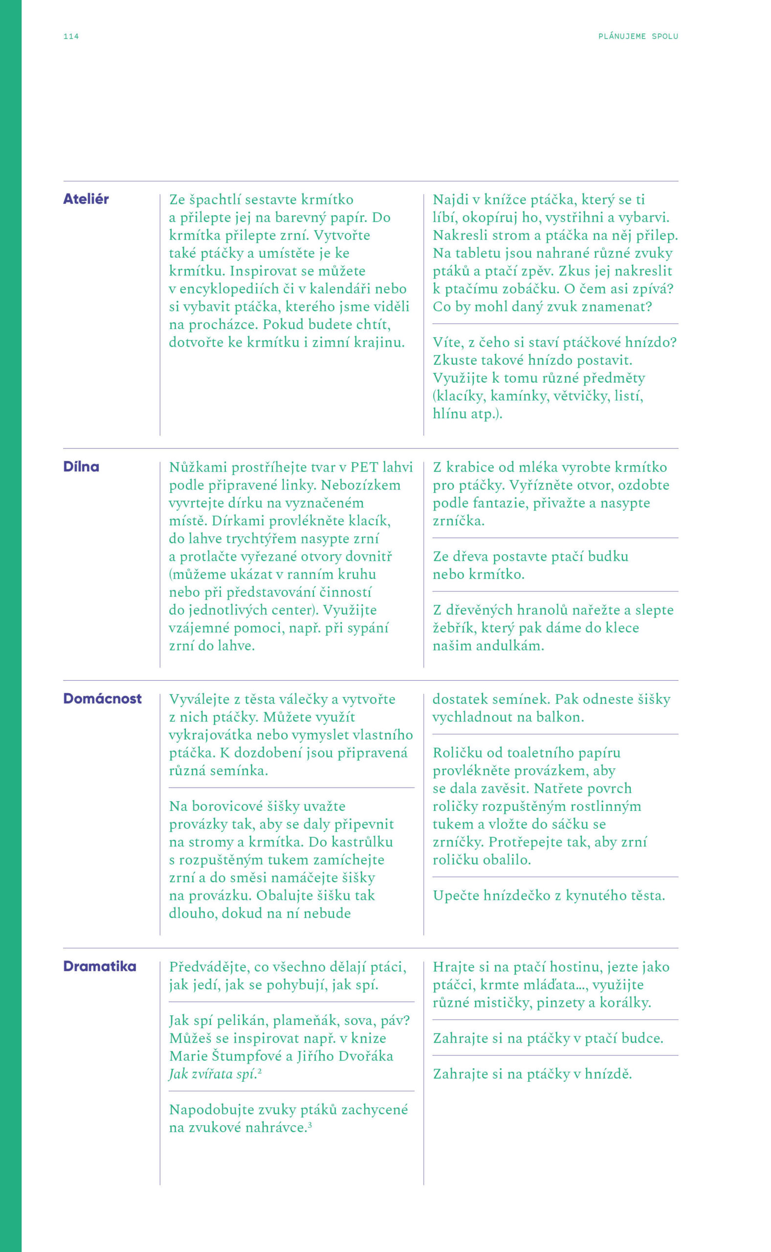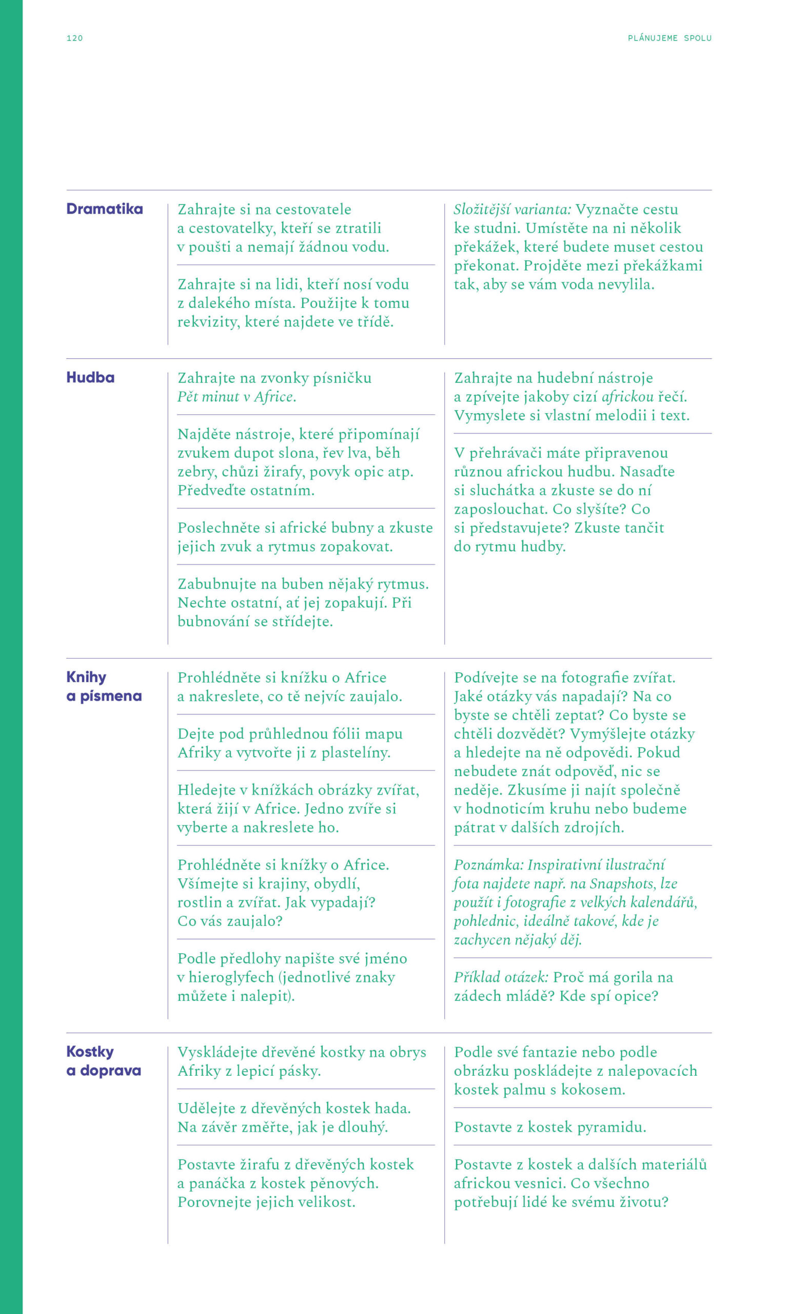 Druhá část obsahuje 20 praktických příkladů zpracovaných do podoby námětových listů (NL). Ty vychází z různých integrovaných tematických bloků, které byly realizované v mateřských školách Začít spolu. Každý NL obsahuje konkrétní příklady, jak rozpracovat jedno téma do všech center aktivit, jak jej propojit s ranními úkoly, činnostmi v ranním kruhu, jak téma přiblížit dětem i mimo MŠ, nabízí možnosti, jak zapojit rodiče atp.