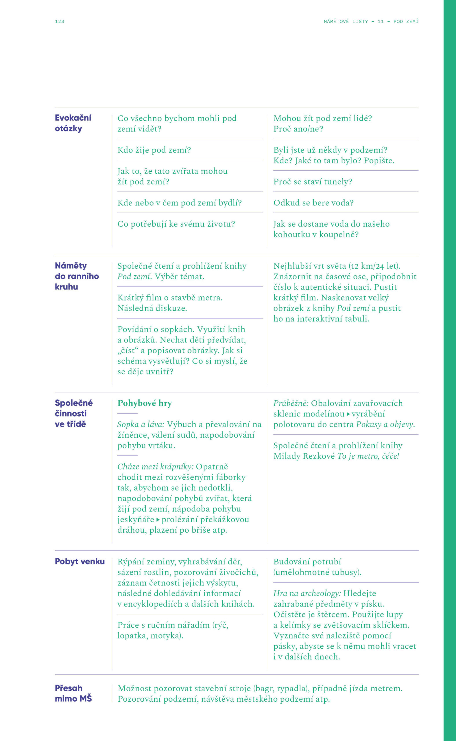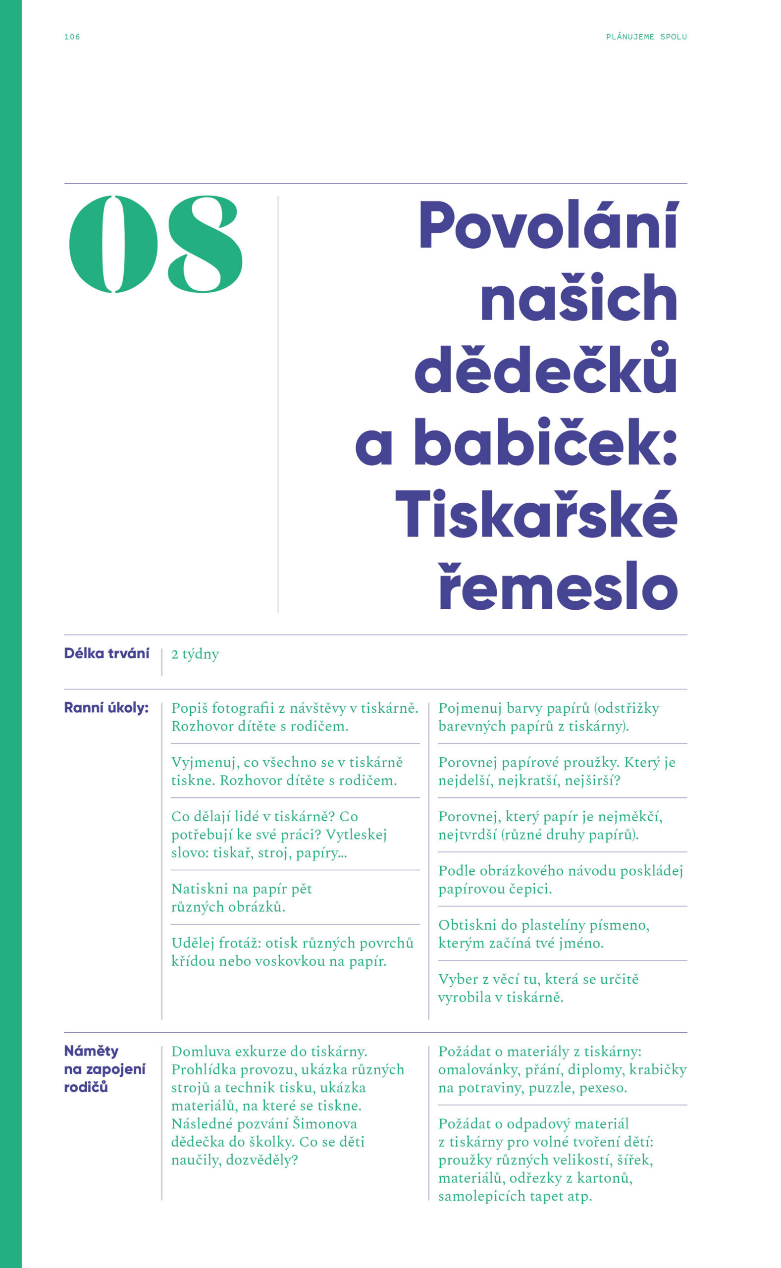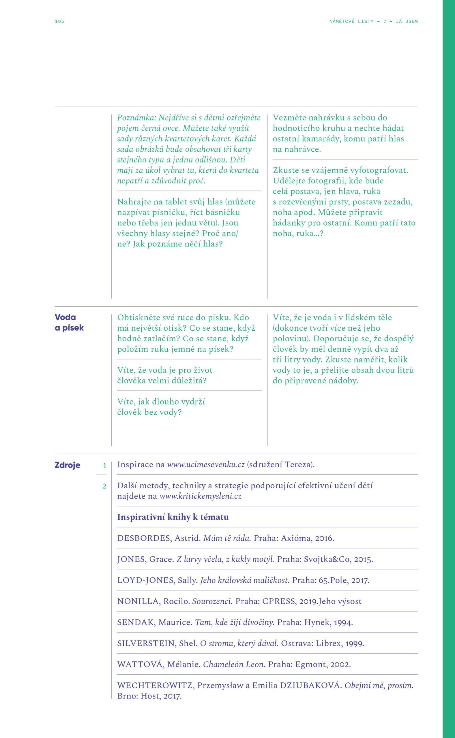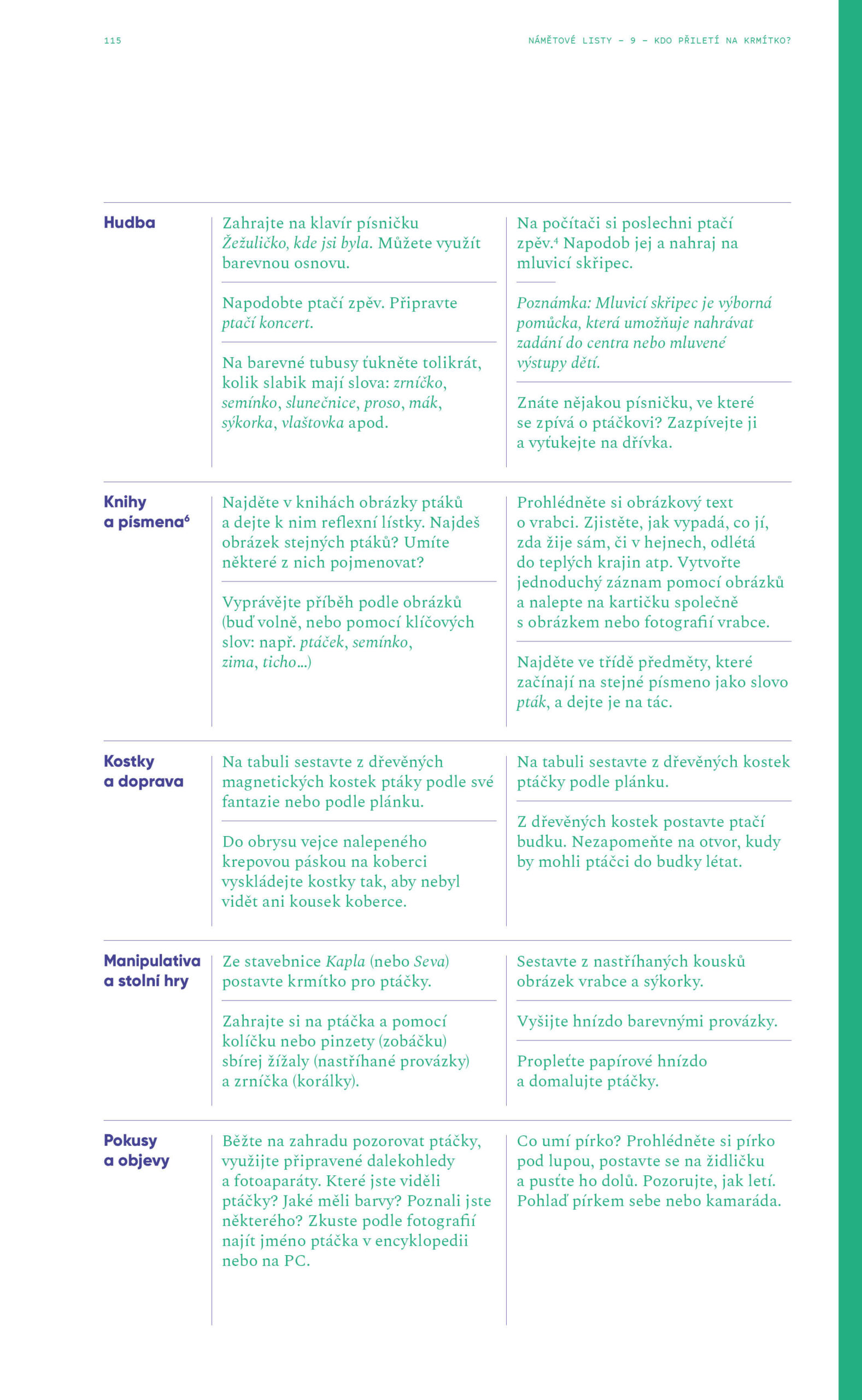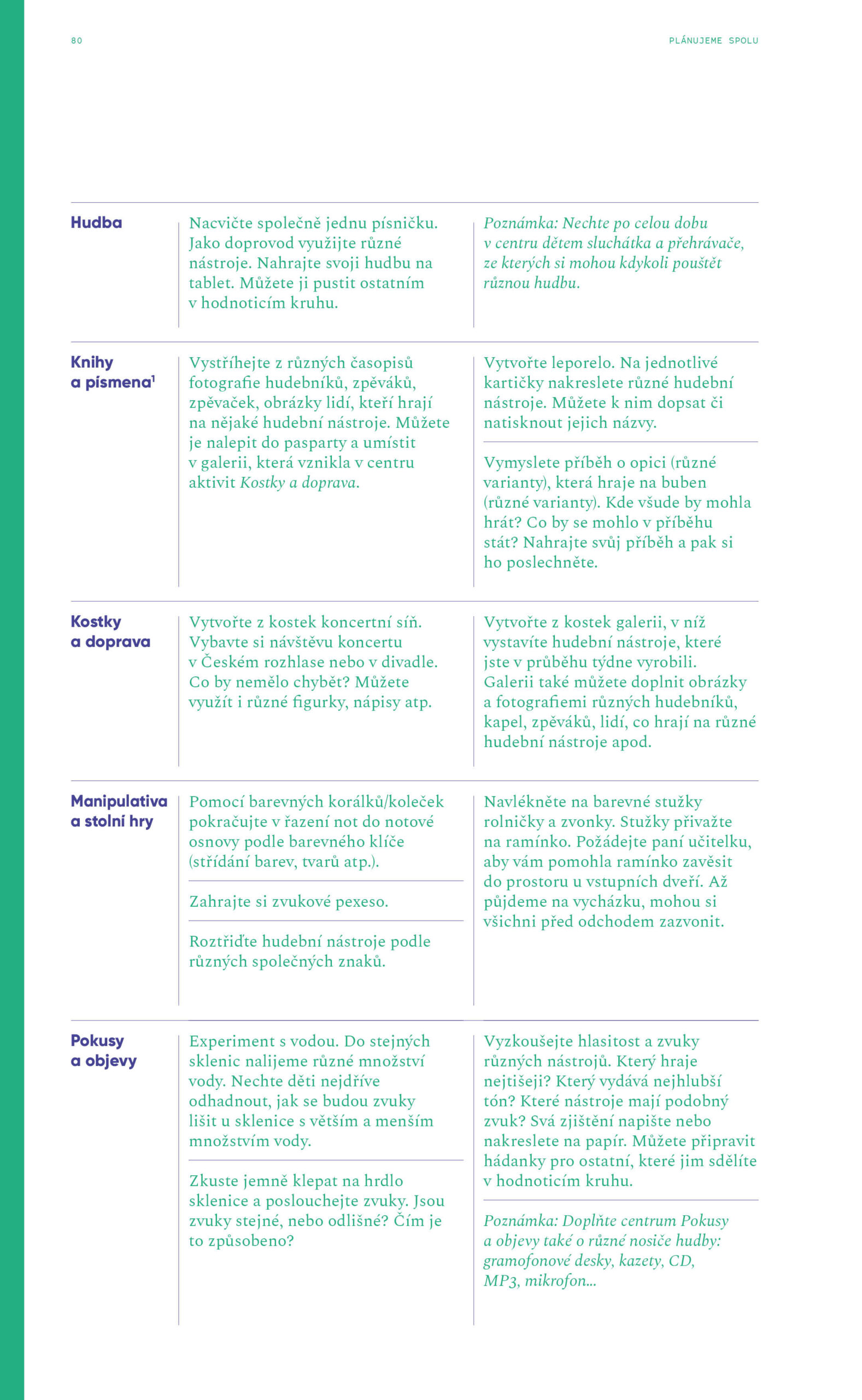 Druhá část obsahuje 20 praktických příkladů zpracovaných do podoby námětových listů (NL). Ty vychází z různých integrovaných tematických bloků, které byly realizované v mateřských školách Začít spolu. Každý NL obsahuje konkrétní příklady, jak rozpracovat jedno téma do všech center aktivit, jak jej propojit s ranními úkoly, činnostmi v ranním kruhu, jak téma přiblížit dětem i mimo MŠ, nabízí možnosti, jak zapojit rodiče atp.