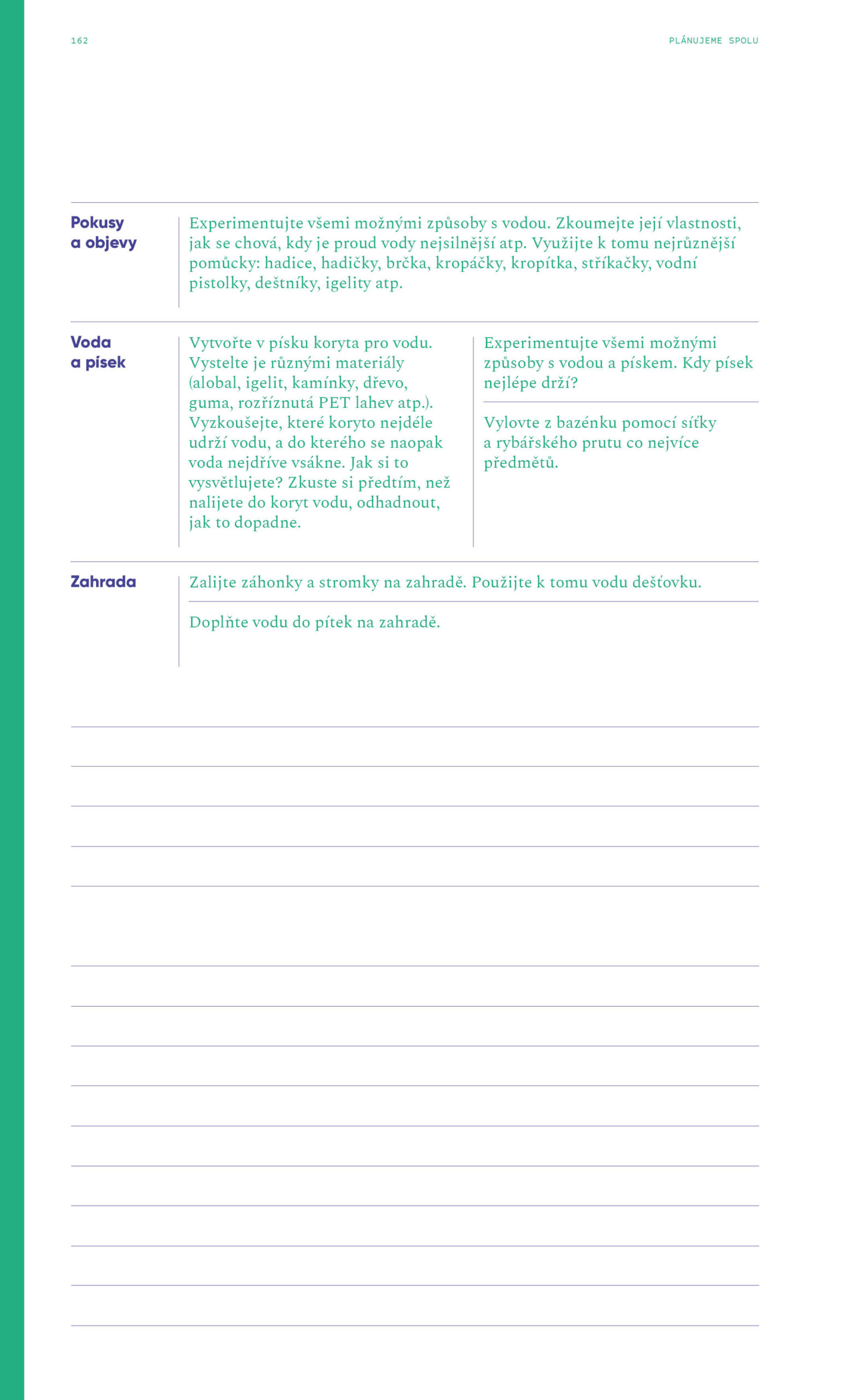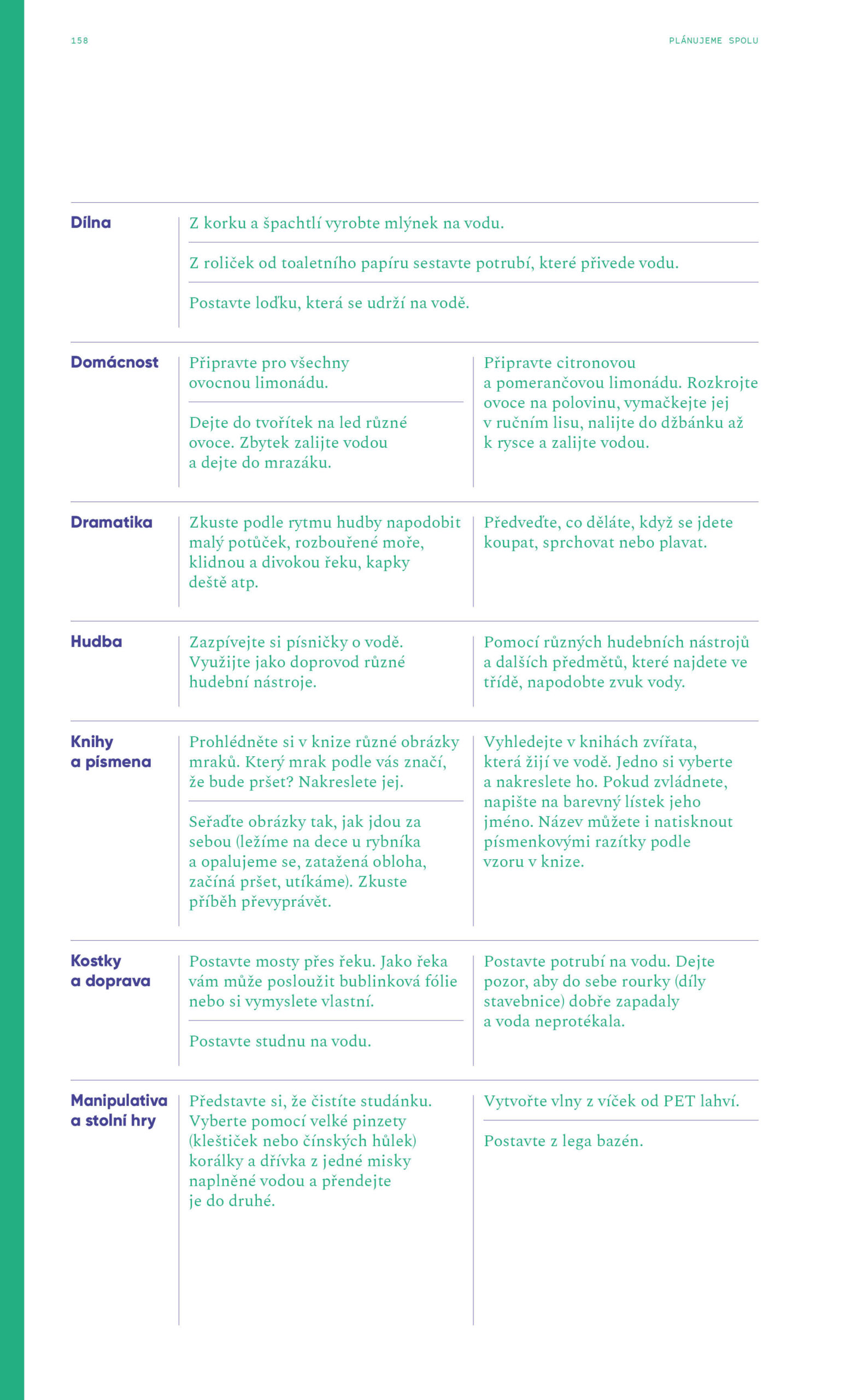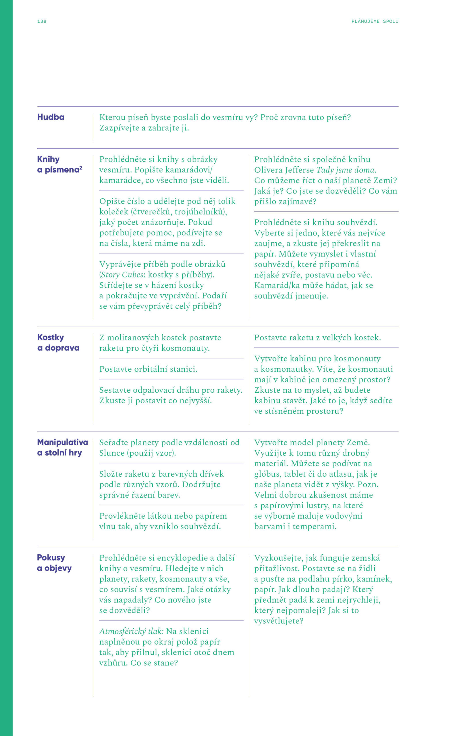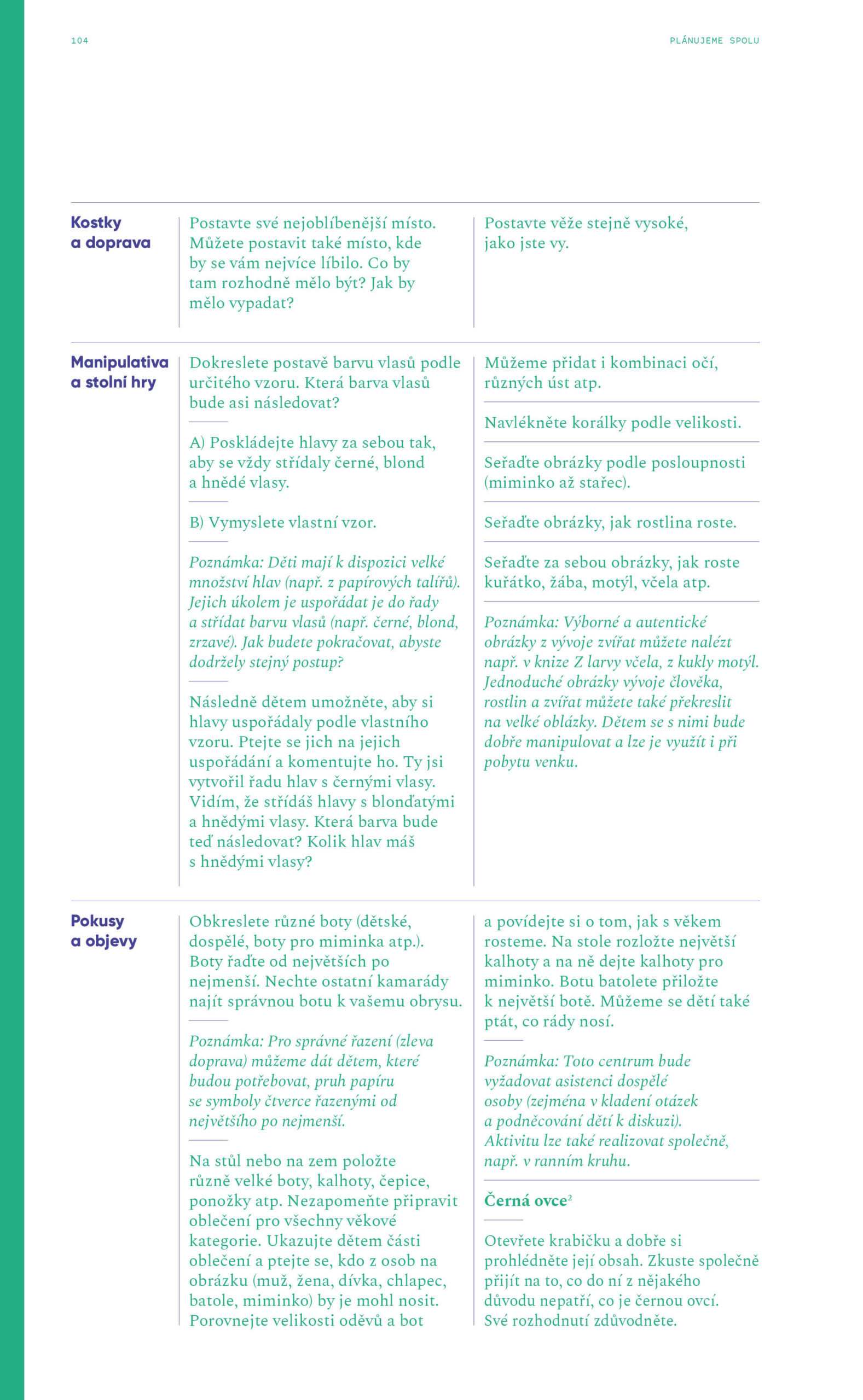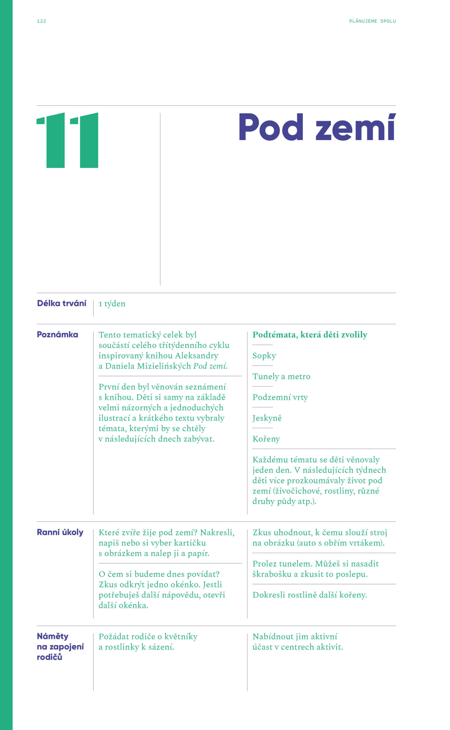 Druhá část obsahuje 20 praktických příkladů zpracovaných do podoby námětových listů (NL). Ty vychází z různých integrovaných tematických bloků, které byly realizované v mateřských školách Začít spolu. Každý NL obsahuje konkrétní příklady, jak rozpracovat jedno téma do všech center aktivit, jak jej propojit s ranními úkoly, činnostmi v ranním kruhu, jak téma přiblížit dětem i mimo MŠ, nabízí možnosti, jak zapojit rodiče atp.